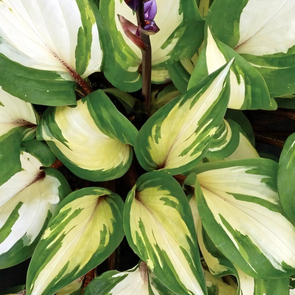 Очень красивая, компактная хоста с пестрыми листьями и заходящими на лист пурпурными черешками и цветоносами.