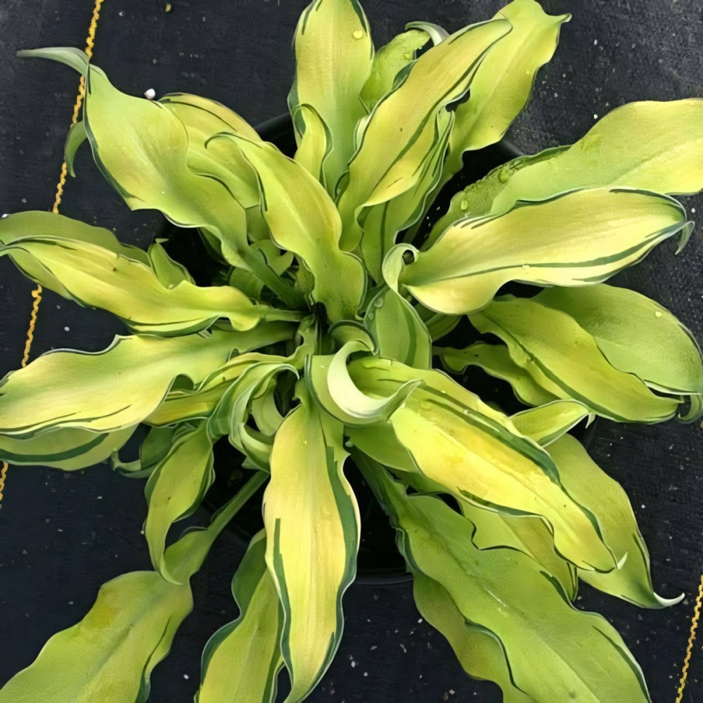 Средняя хоста. Листья ланцетные, очень сильно волнистые, скрученные и завитые, с желто-яблочного цвета узкой, голубовато-зеленой перьевидной каймой. Скорость роста средняя. Очень красивый и необычный сорт.