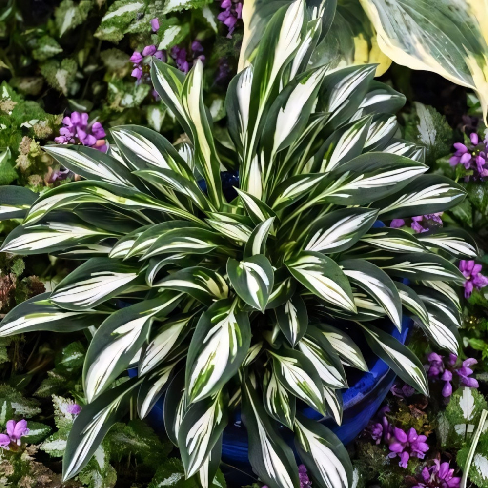 Эта хоста имеет маленькие узкие листья, плотные, ярко зеленые, обильно разрисованные белыми и зелеными полосами, в связи с чем выглядит очень контрастно. Очень эффектное растение!