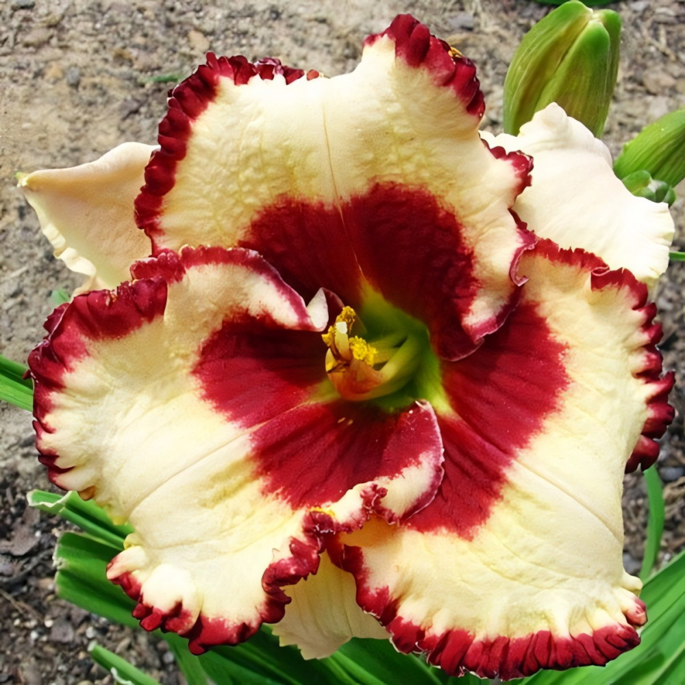Кремовый цветок с красным глазком и такого же цвета гофрированная окантовка. Очень красив!!! Ароматный! Высота - 60-70 см, диаметр - 14 см.
