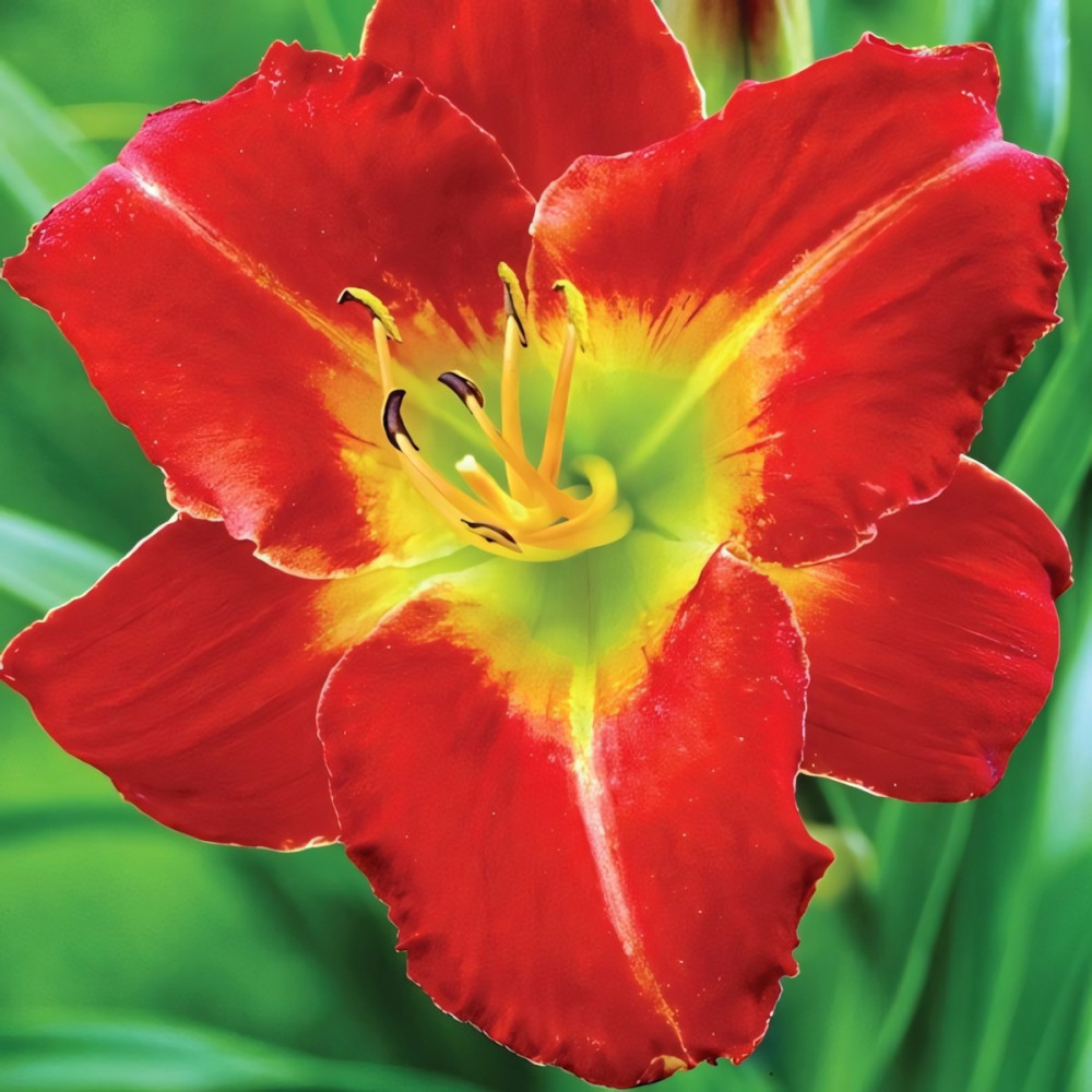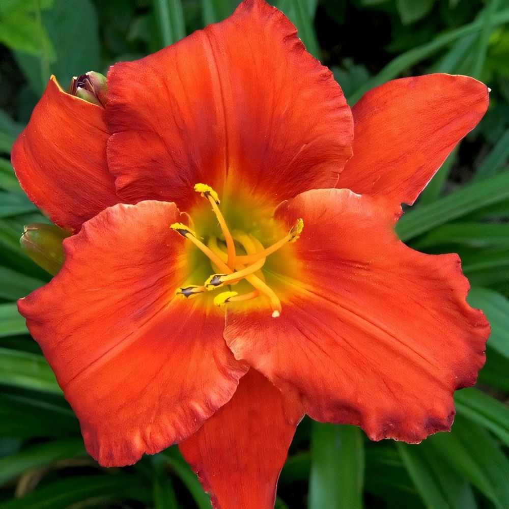 Яркий огненно-рыжий сорт лилейника, середина лимонно-желтого цвета. Края лепестков слегка волнистые. Листва узкая, мечевидная.