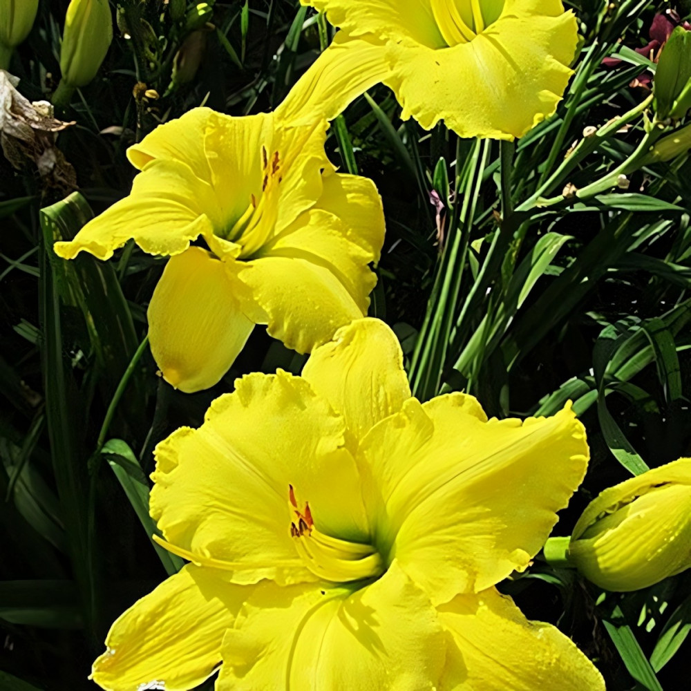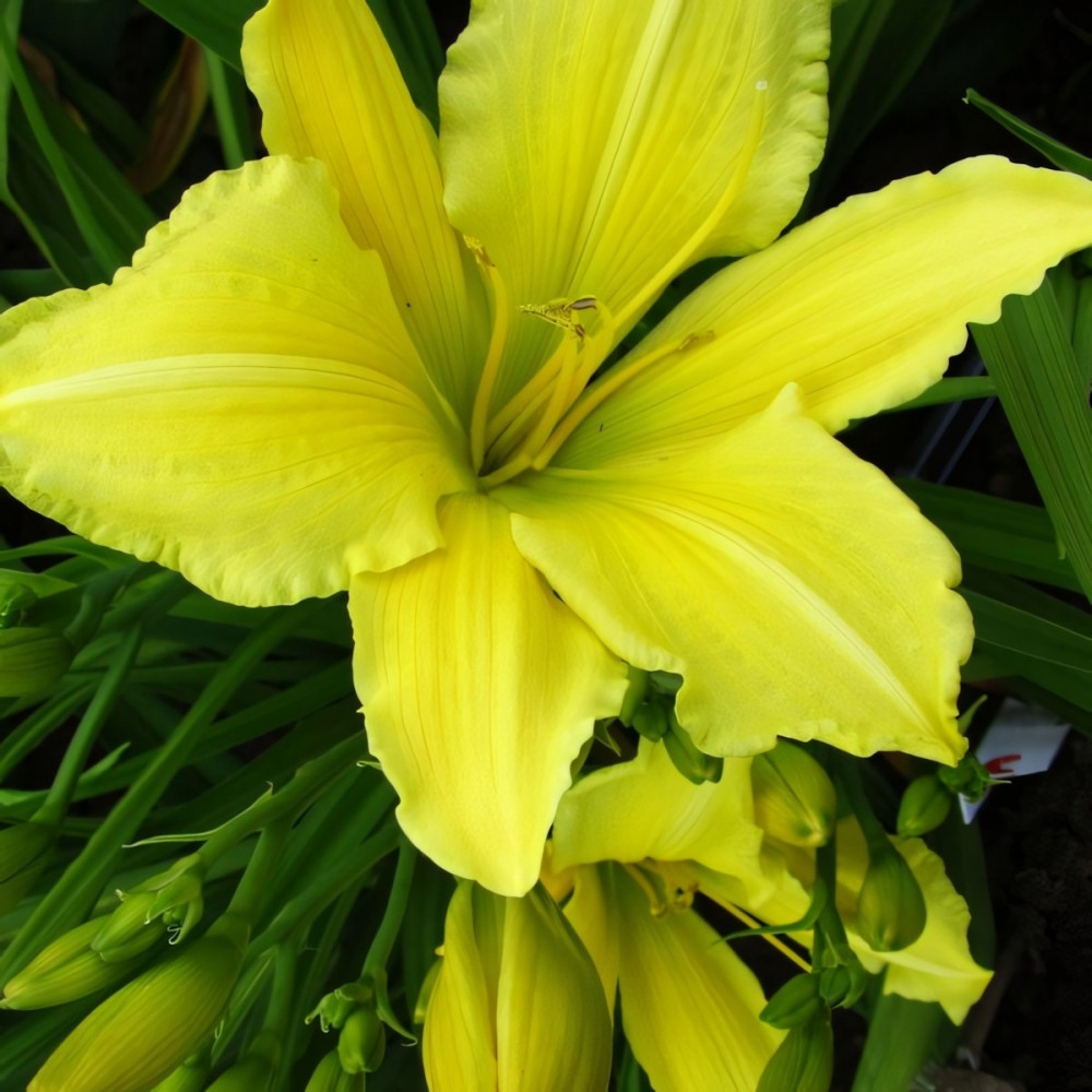 Ярко-желтый лилейник с зеленым горлом. Высота растения - 76 см, диаметр цветков 17 см.