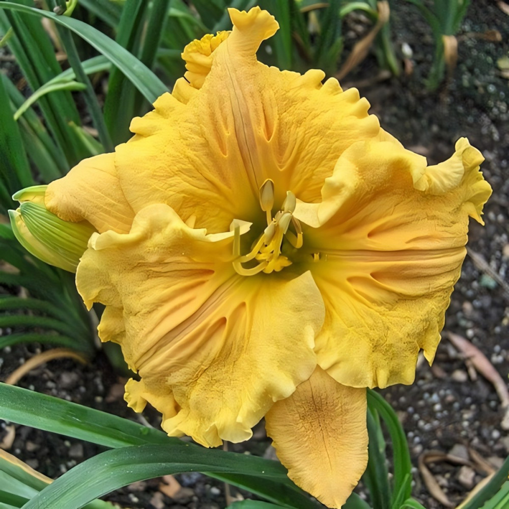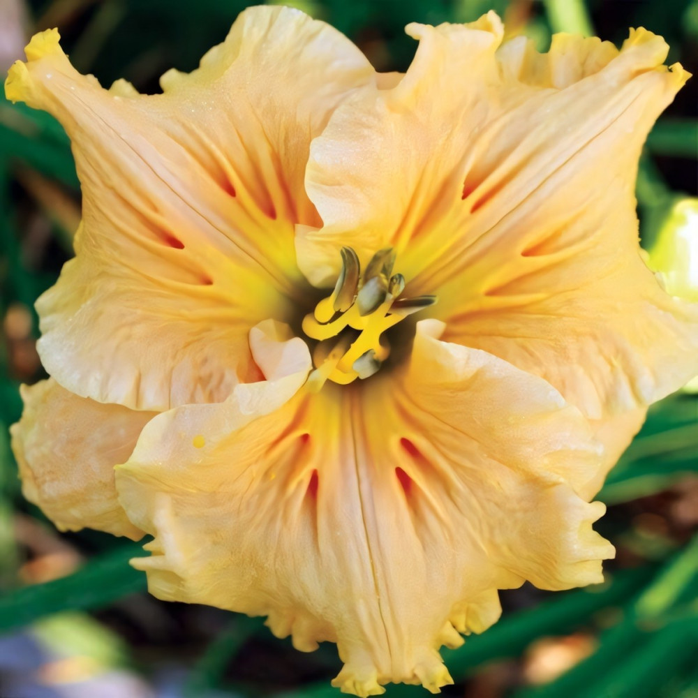 Цветок золотой с зеленым горлом и гофрированными краями лепестков. Очень ароматный. Цветение обильное. Цветы очень эффектные - с рельефным рисунком в виде пера по центру лепестка! Повторноцветущий. Листва узкая, мечевидная.