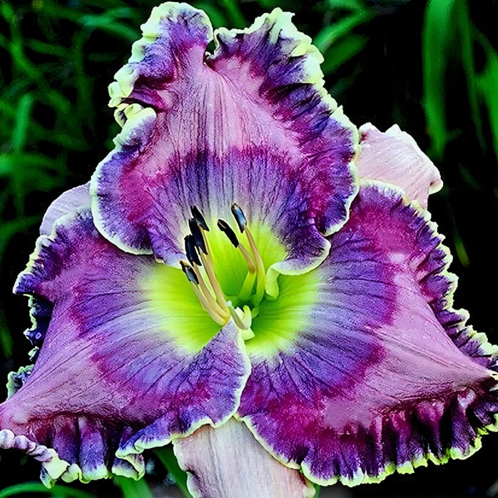 Высота - 94 см, диаметр цветка - 16,5 см. Крупный цветок с синим глазом и лавандово-лиловыми лепестками, двойная салатово-лиловая окантовка.