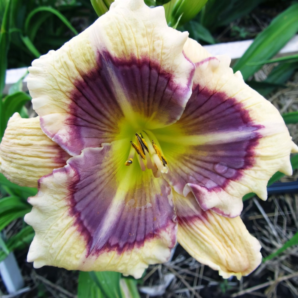 Высота - 89 см, диаметр цветка - 11 см. Кремовый, с синим глазом и с фуксиновым обоком и такой же окантовкой. Очень нежный и красивый.