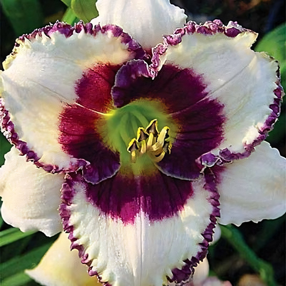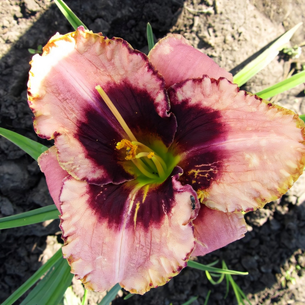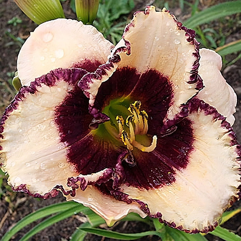 Высота - 65 см, диаметр цветка - 15 см. Очень нежный сливочно-розовый цветок с темно-вишневой гофрированной каймой и темно-вишневым горлом. Наверняка внесет свой колорит в ваш сад. Очень красивый, современный сорт!