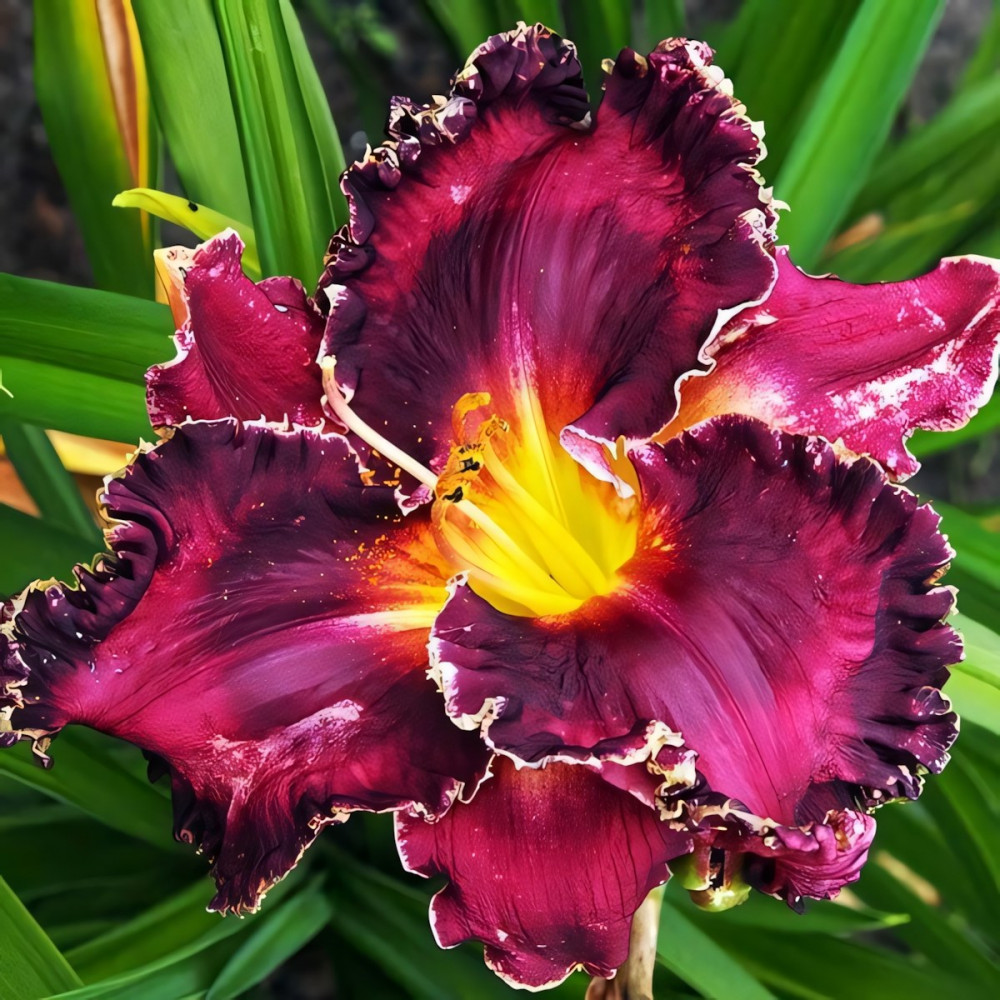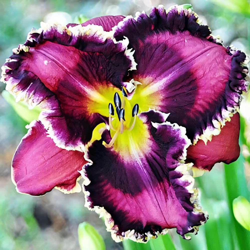 Высота - 70 см, диаметр цветка - 16,5 см. Темно-фиолетово-розовый лилейник с двойной каймой, почти белый зубчатый край переходит в темно-сливово-синюю кайму и такой же темный глаз. Фантастические цветы- пожалуй, один из лучших в этой цветовой гамме.