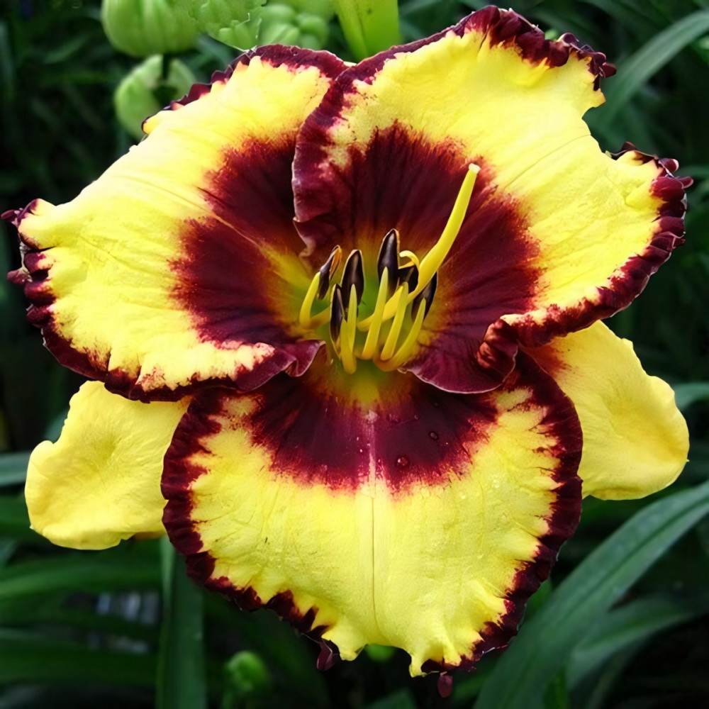 Этот лилийник станет ярким акцентом на вашей клумбе! Прочные цветоносы венчают большие светло-жёлтые цветки с бордовым центром и широкой гофрированной каймой.