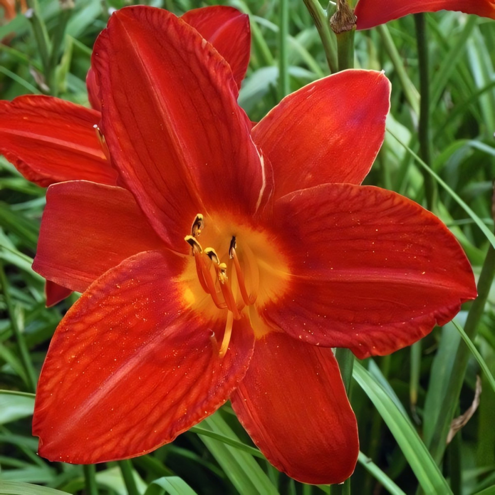 Цветок ярко-красного окраса с желтым горлом.