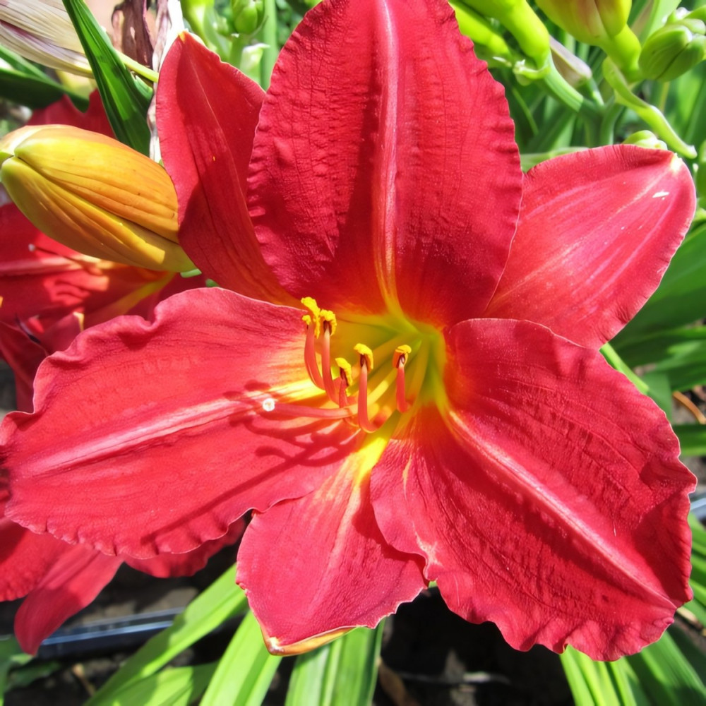 Аленький цветочек! Данный сорт обязательно станет фаворитом в вашем саду! Каждый день встречает новый распустившийся бутон, а каждый вечер он увядает, и так происходит в течение 25-35 дней. Эффектный красно-пурпурный цвет ярко подчеркивает золотистое горлышко цветка. Цветки по форме напоминают лилии, до 15-18 см в диаметре.