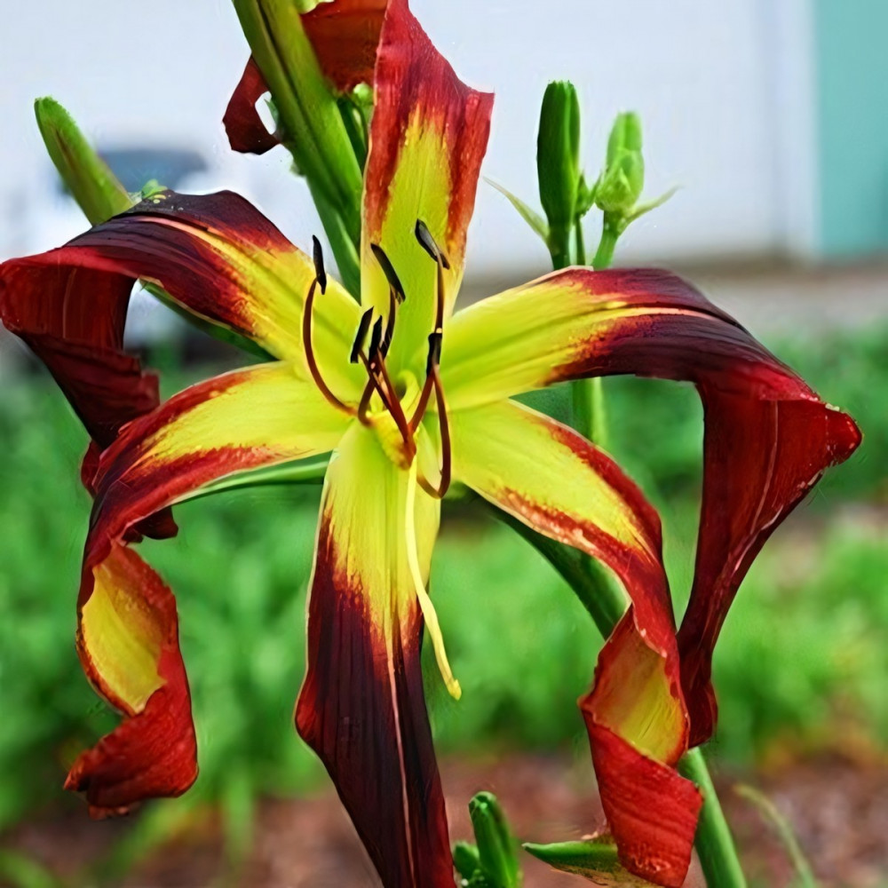 Спайдер. Высота - более 100 см, диаметр цветка - 32 см. Огромный, вишнево-времовый, с зеленым горлом.