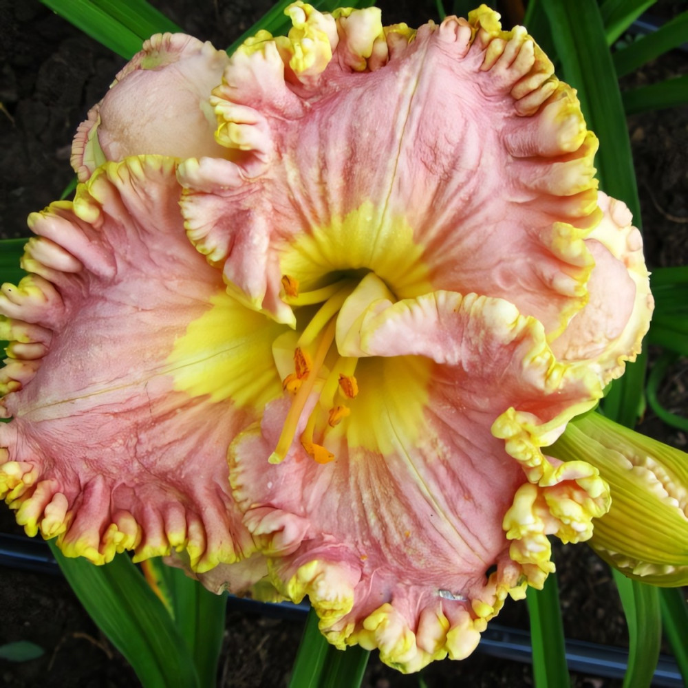 Высота - 76 см, диаметр цветка - 18 см. Крупный цветок нежно-розового окраса с широкой желтой каймой и серединкой. Края сильно гофрированные. Зев светло-зеленый.