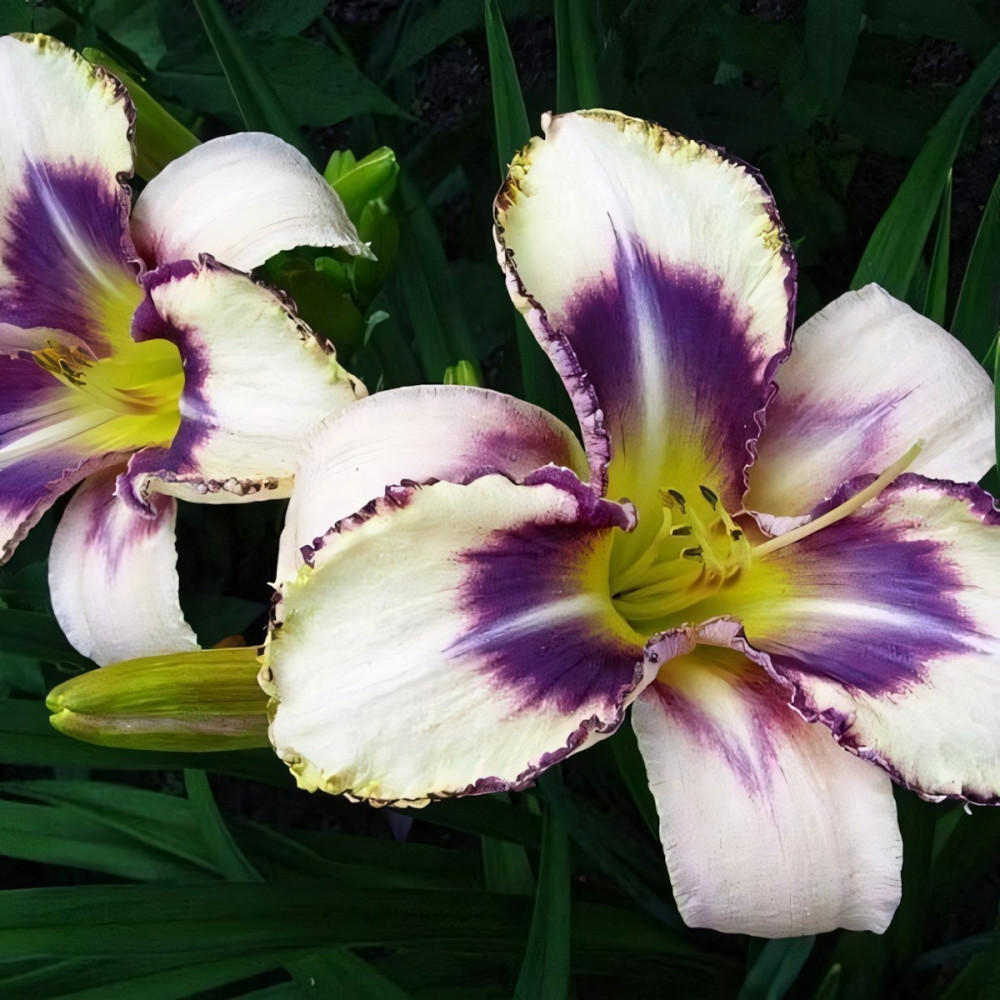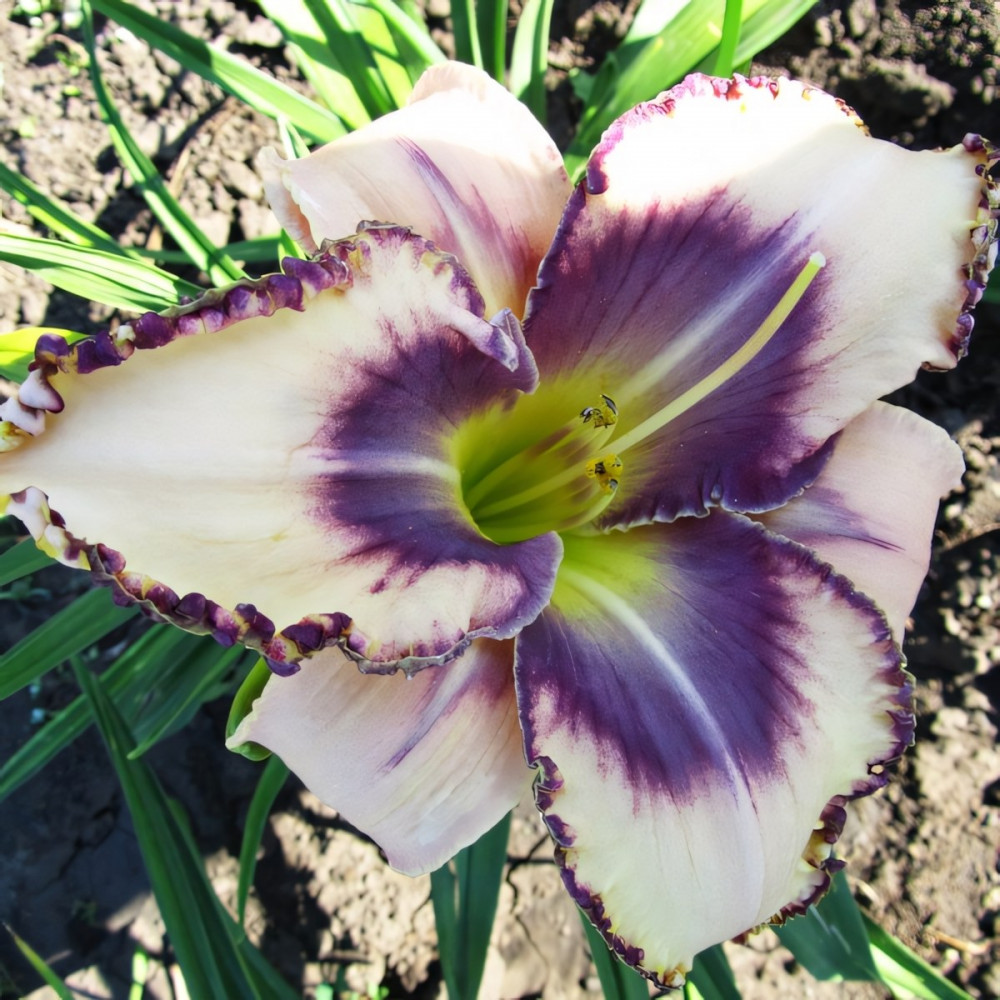 Высота - 60 см, диаметр цветка - 16 см. Цветок крупный, нежно-розово-кремовый с красивым сиреневым глазком и такой же тонкой каймой по краю гофрированного лепестка. Горло ярко-желтое. Супер, как красив!!!