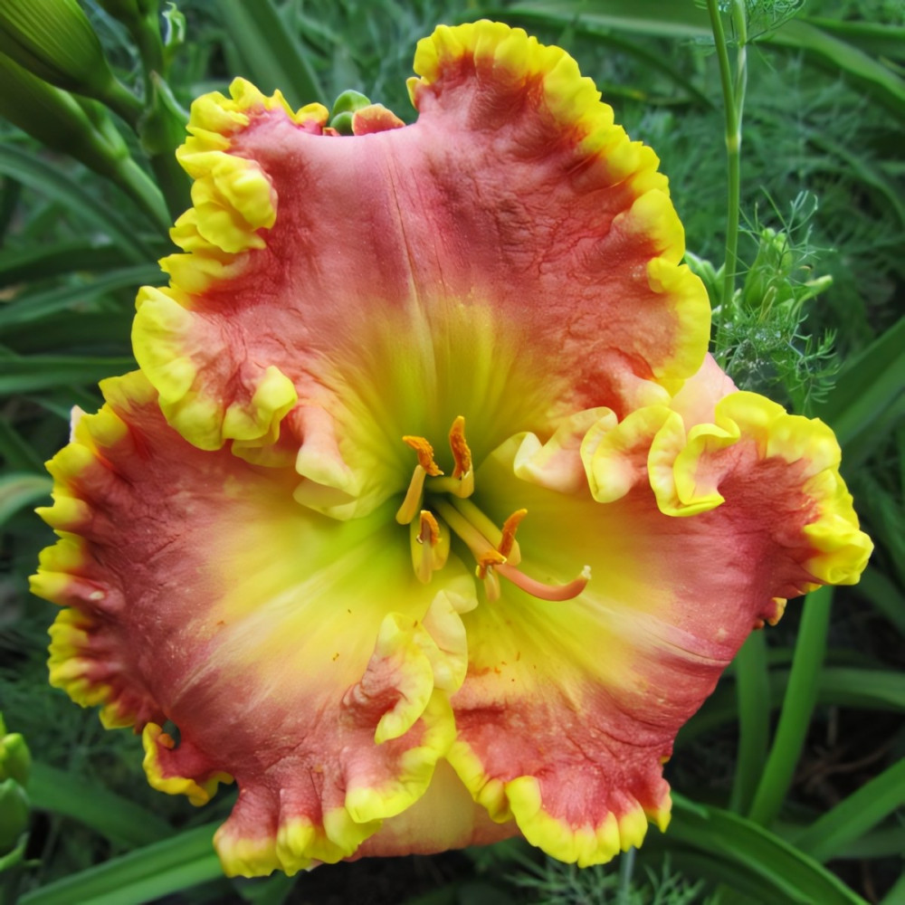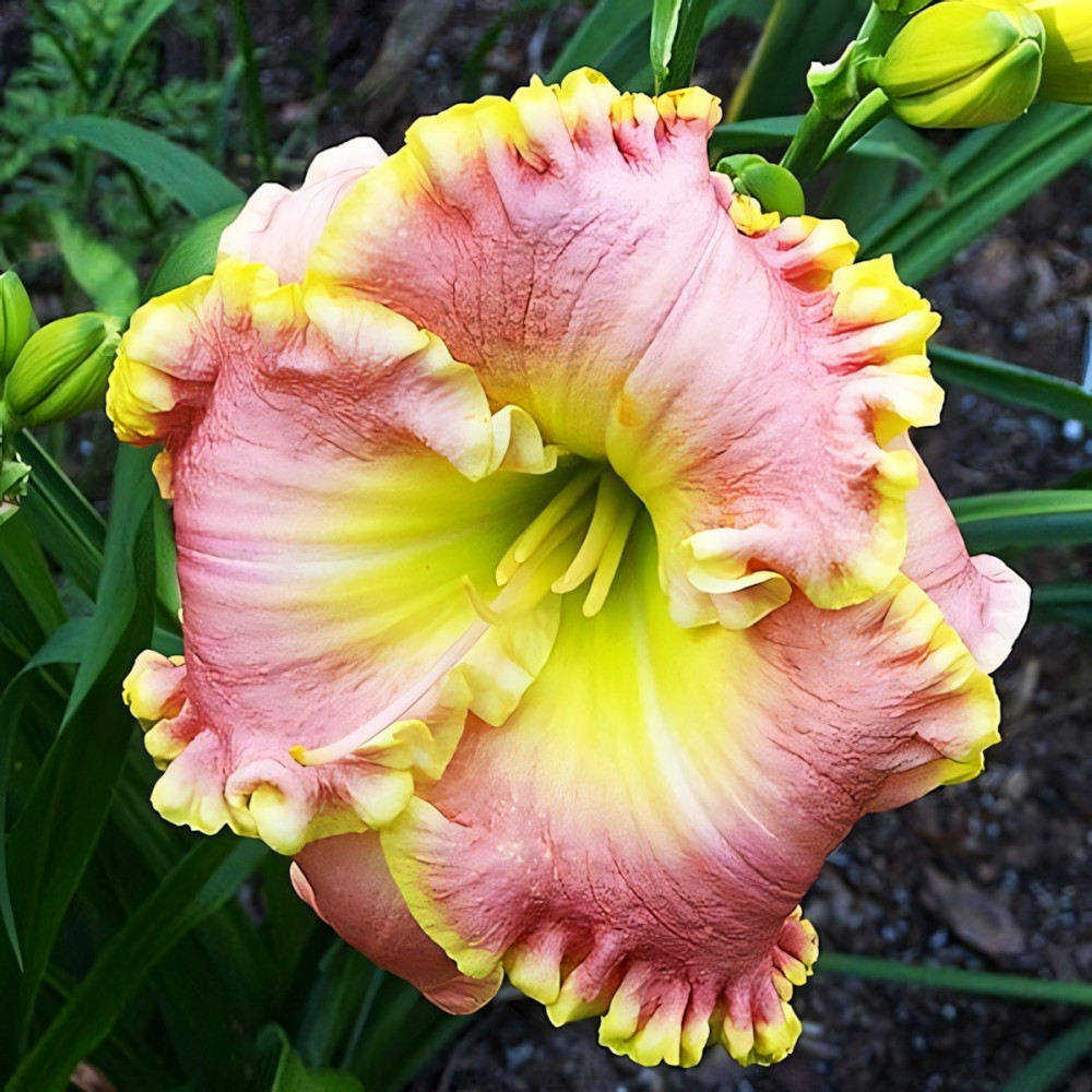 Высота растения - 63 см, диаметр цветка - 13 см. Красивой формы цветок насыщенно-розового цвета с зелёным горлом и лимонной вспененной каймой.
