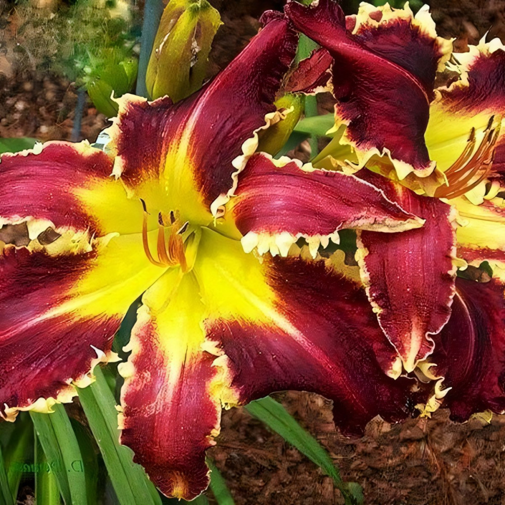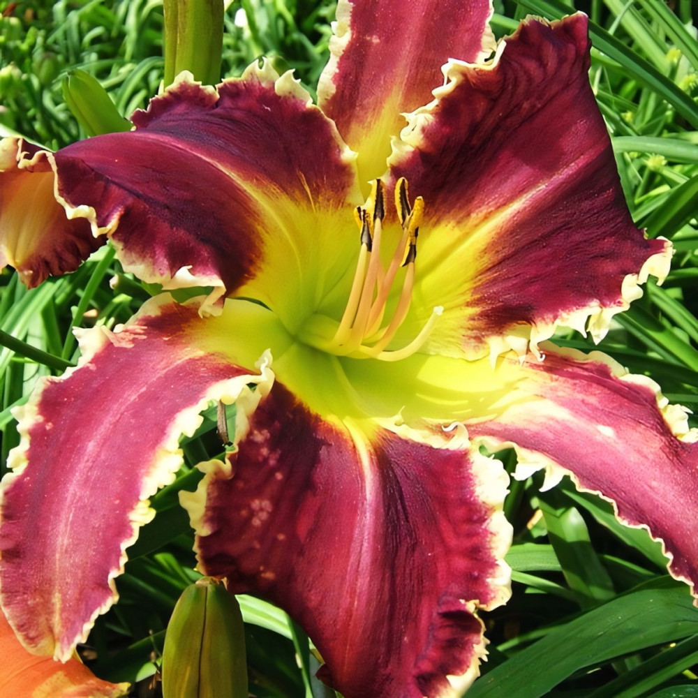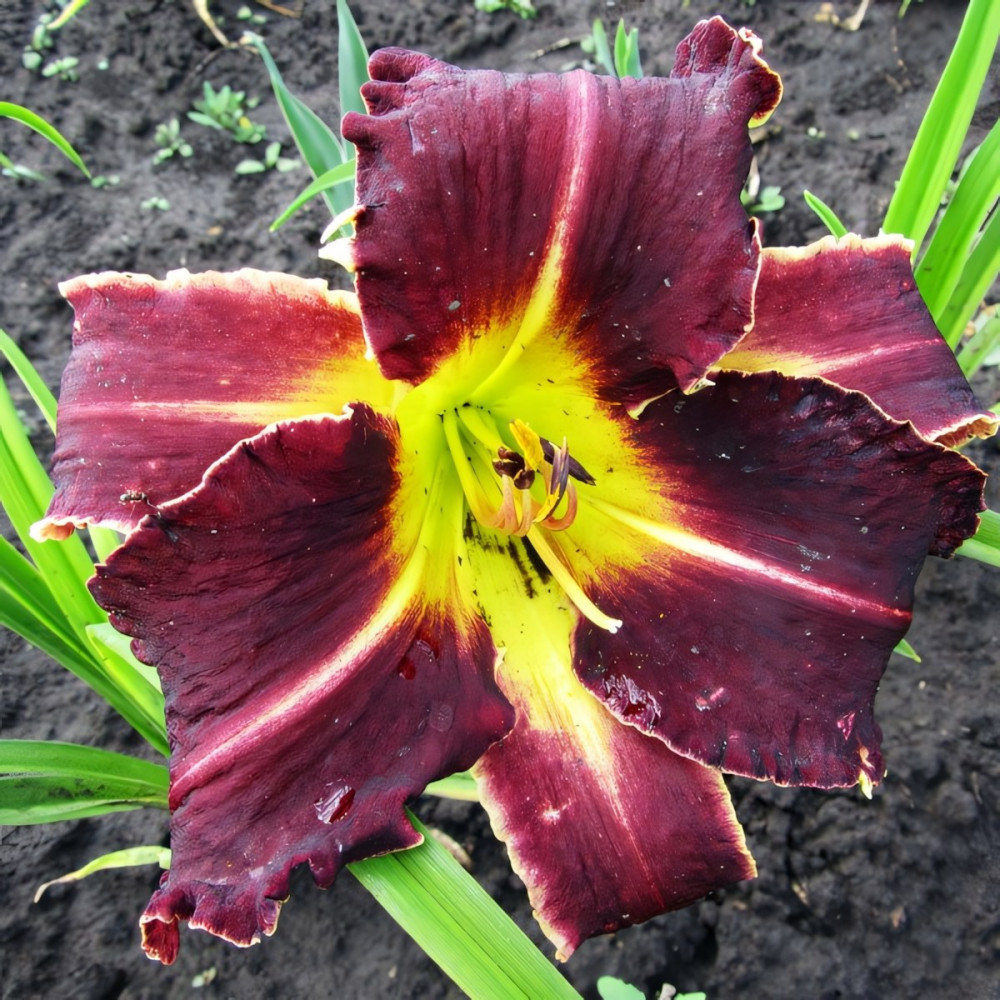 Диаметр цветка - от 19 до 25 см. Очень крупный, фиолетово-бордовый, с желтым зубчатым краем, желто-зеленым горлом. Не капризный, хорошо зимует и хорошо нарастает.
