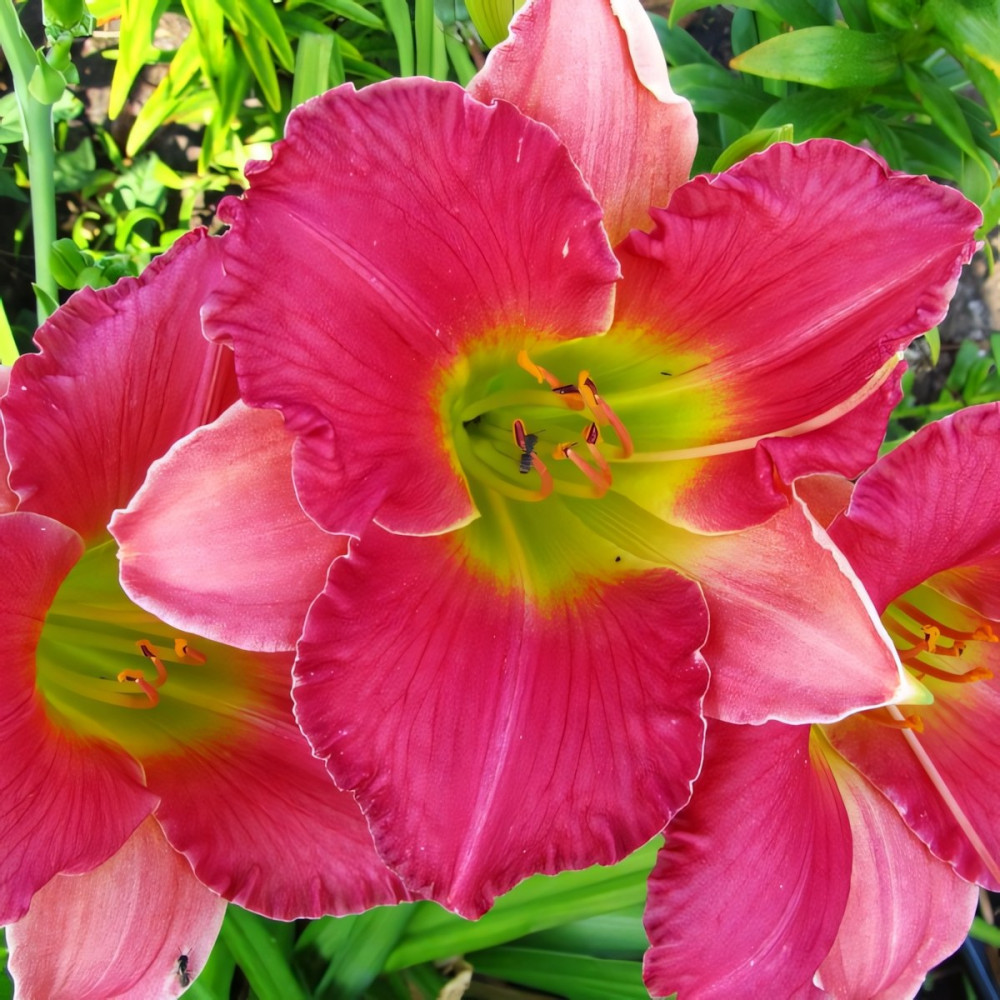 Насыщенные розово-лавандовые внутренние лепестки широкие, волнистые, отогнутые, внешние - нежно-кремово-розовые. Горло желто-зеленое. Очень необычная окраска! Очень яркий, виден издалека!!!