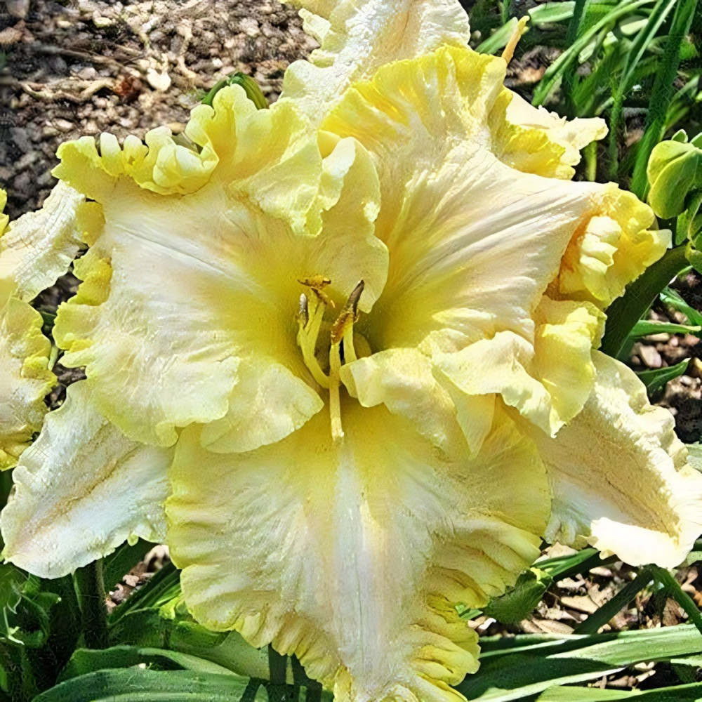 Диаметр цветка - от 17,5 см, высота - 65 см. Огромный, сливочно-желтый с розовой подложкой. Оборка 2 см. Цветет очень продолжительно. Ранне-среднего срока цветения. Красавец!!!