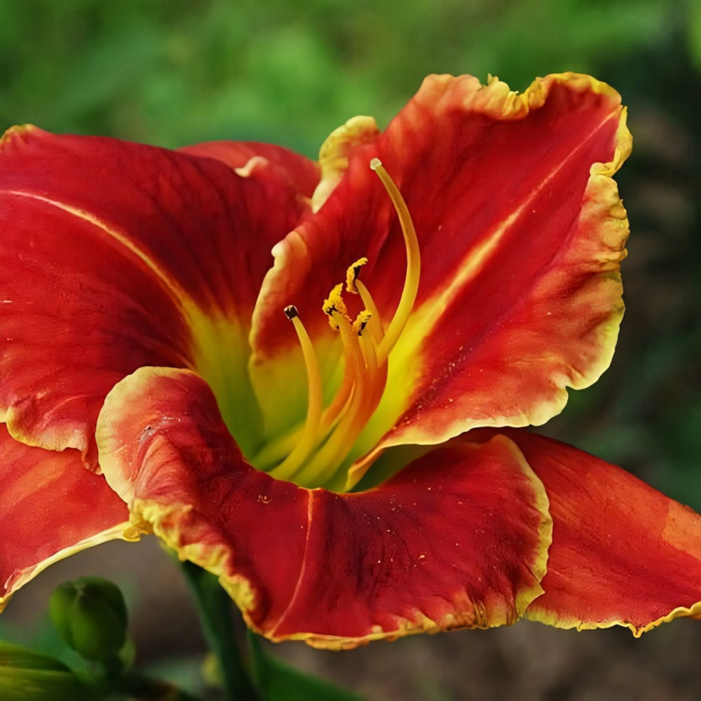 Ярко-красный цветок, с ярко-зеленым горлом и такого же цвета каймой, слегка гофрированный. Высота растения - 70 см, диаметр цветков 15 см.