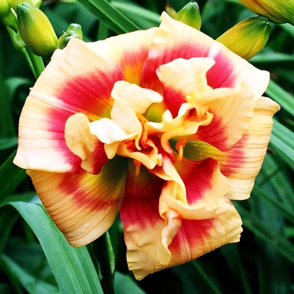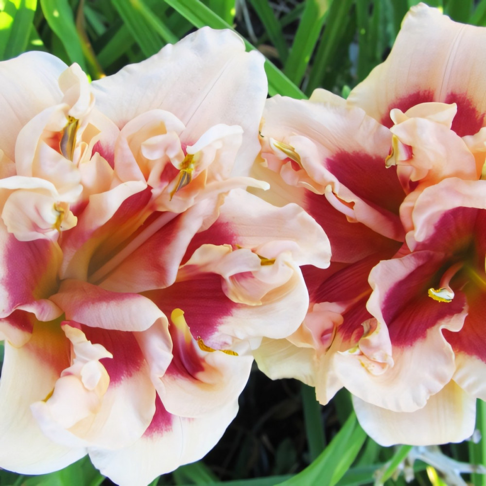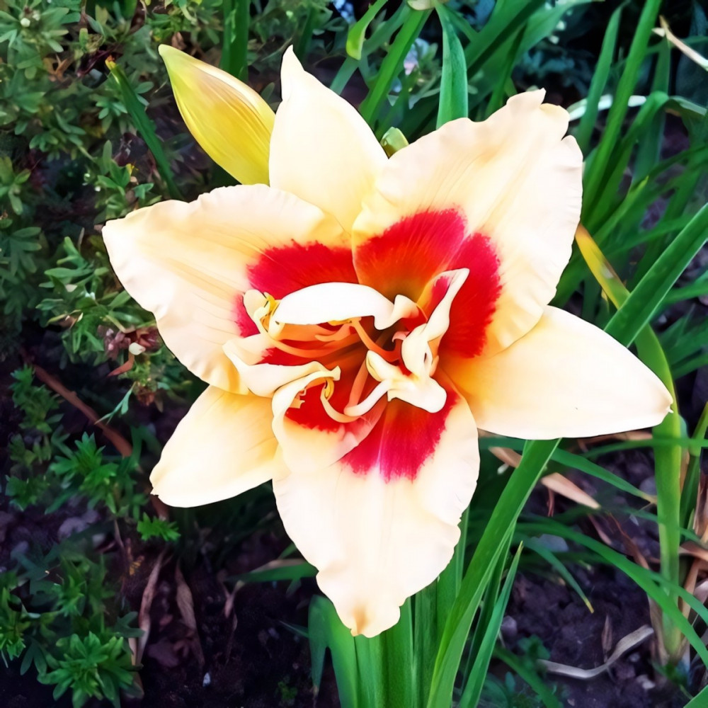 Шикарный махровый лилейник, нежно кремово-розового цвета с кирпично-красным глазом, зеленое горло. Сохраняет декоративность с весны до глубокой осени. На одном месте может расти очень долго, образуя крупные, широкие кусты.