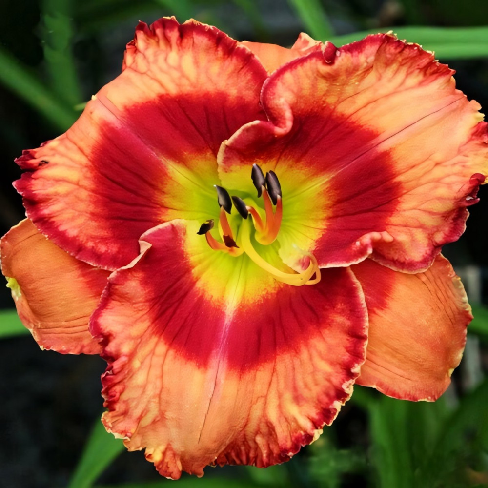 Высота - 75 см. Диаметр - 16 см. Гофрированный землянично-розовый цветок с большим красным глазом и такой же каймой. Горло зеленое.