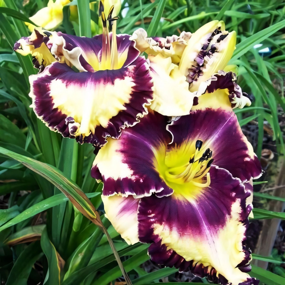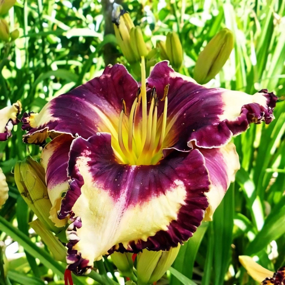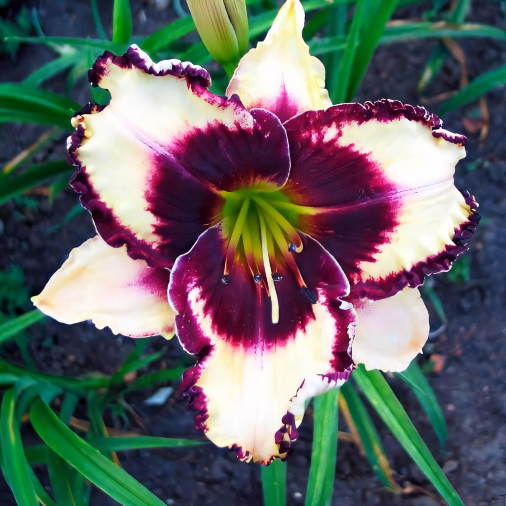 Цвета сливочного масла с глубоким бордово-фиолетовым глазом и гофрированным краем. Высота растения - около 68 см, диаметр цветка - до 18 см.