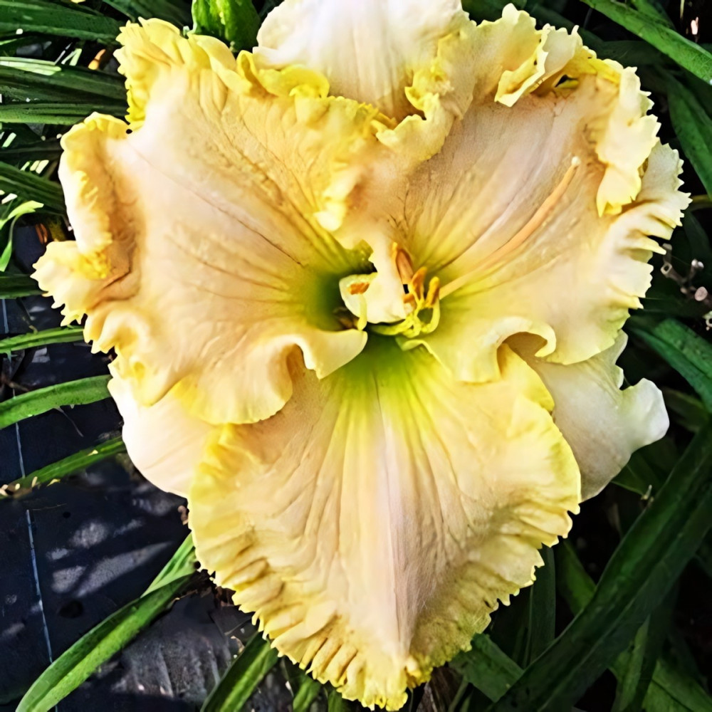 (Frank Smith, 2011) Треугольной формы цветок, кремовый с легкой розовинкой. Горловина нежно зеленая. Край цветка плотно и глубоко гофрирован с жёлто-зеленоватой окраской. Очень красив! Высота растения - около 75 см, диаметр цветка - до 20 см.