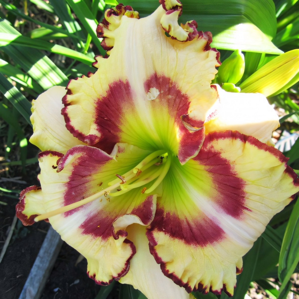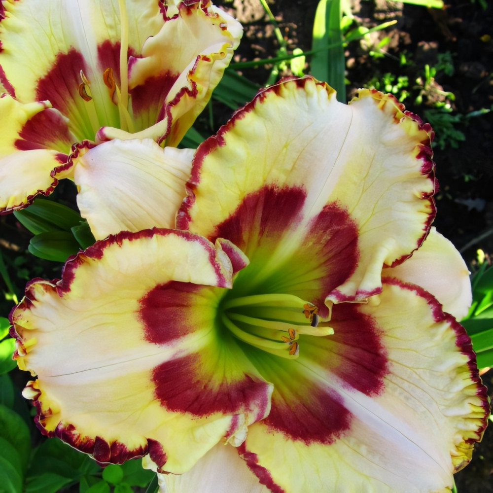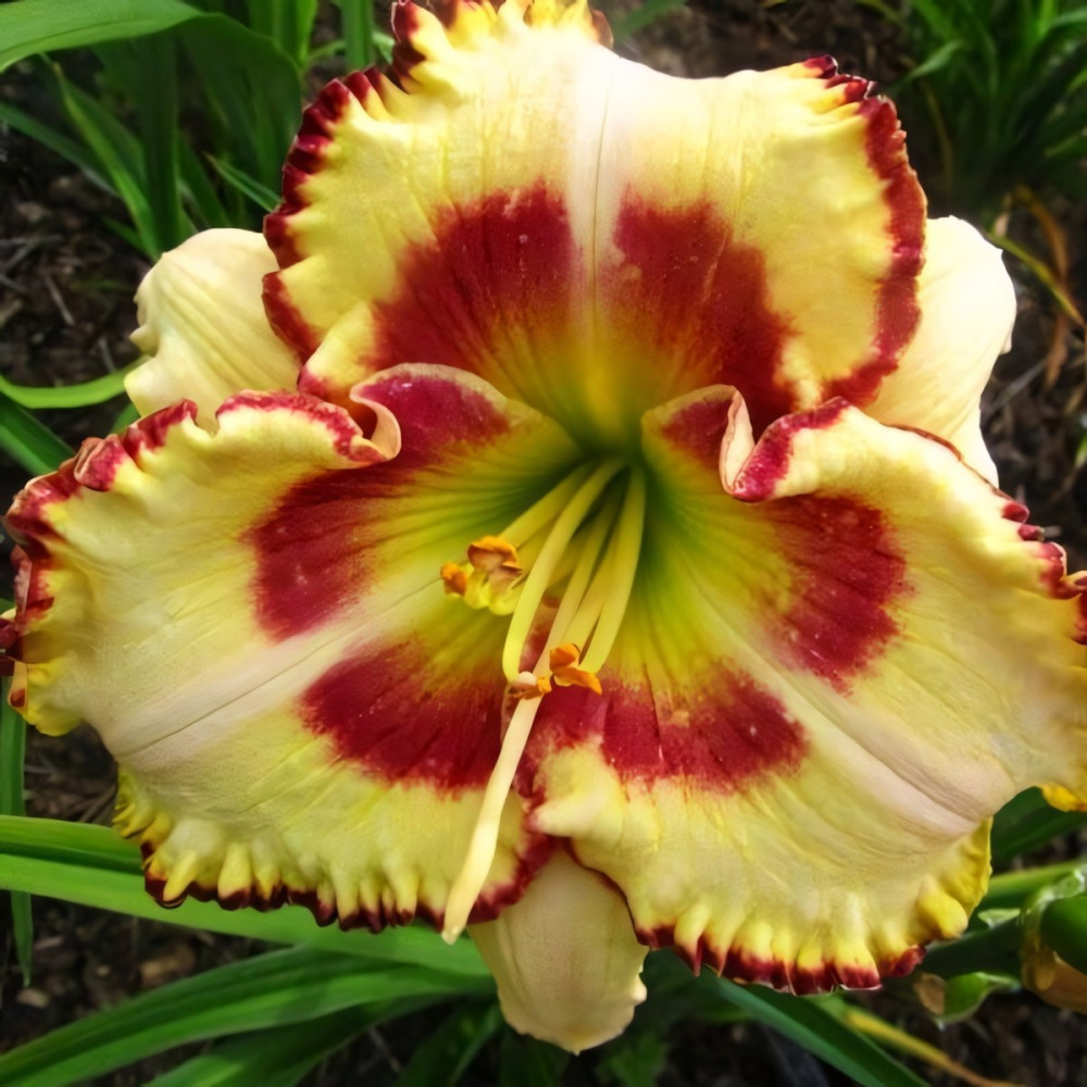 Очень крупный кремовый цветок с ярко-красным глазом и сильно гофрированной двойной красно-желтой каймой. Горло желтое, в глубине зеленое. Ароматный, дневного цветения. Высота растения - 65 см, диаметр цветка - около 16 см.