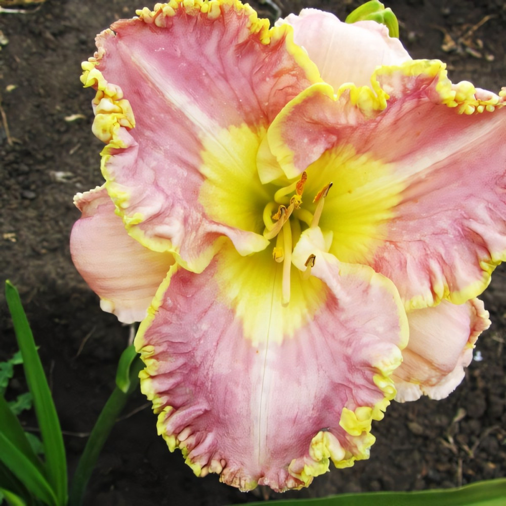 Нежно-лавандовый цветок с желто-золотистой каймой и желтым горлом, гофрированный, повторное цветение. Очень красив! Высота растения - 65 см, диаметр цветков 15 см.