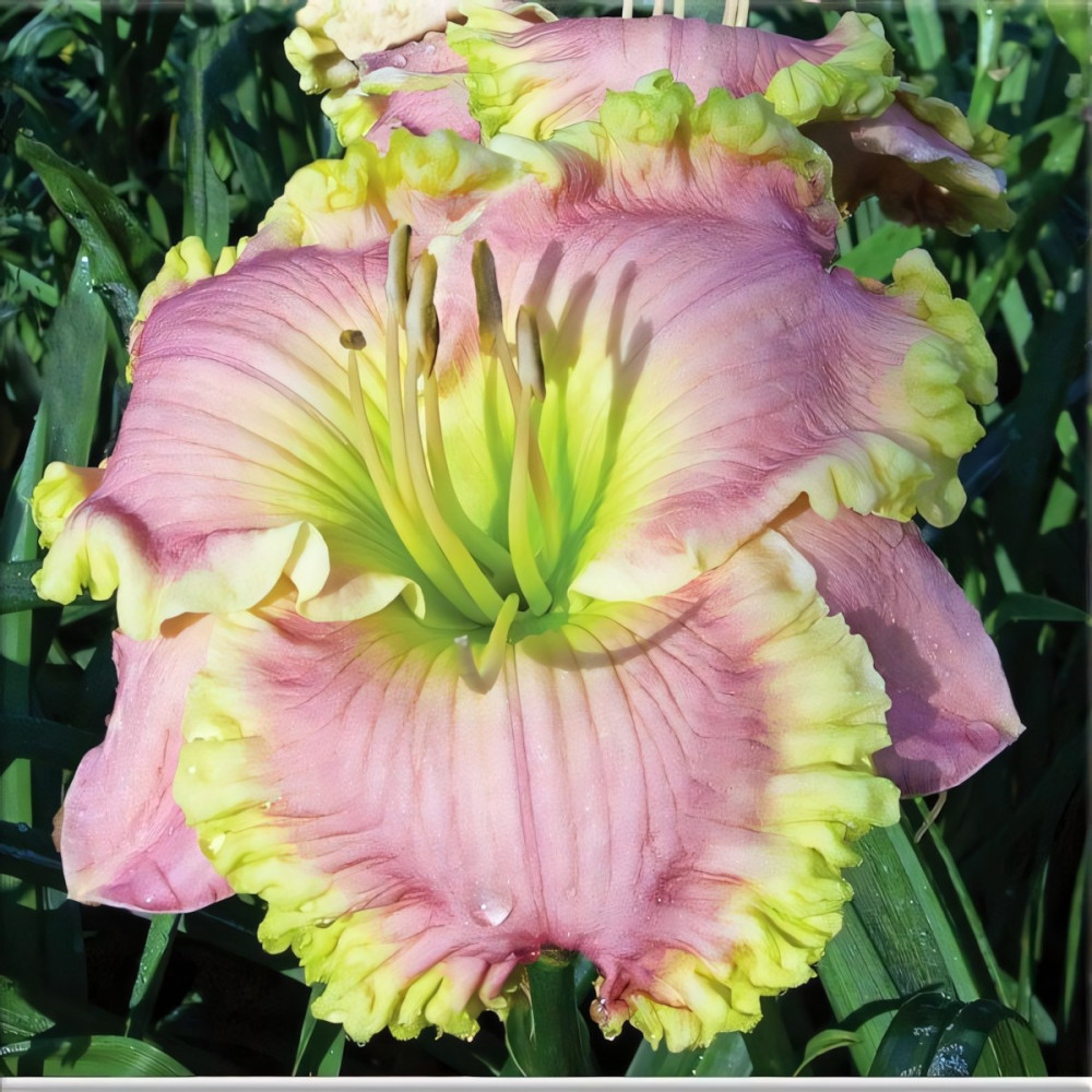 Высота растения - около 91 см, диаметр цветка - до 17 см. Бледно-розовый с гофрированной желтой каймой.