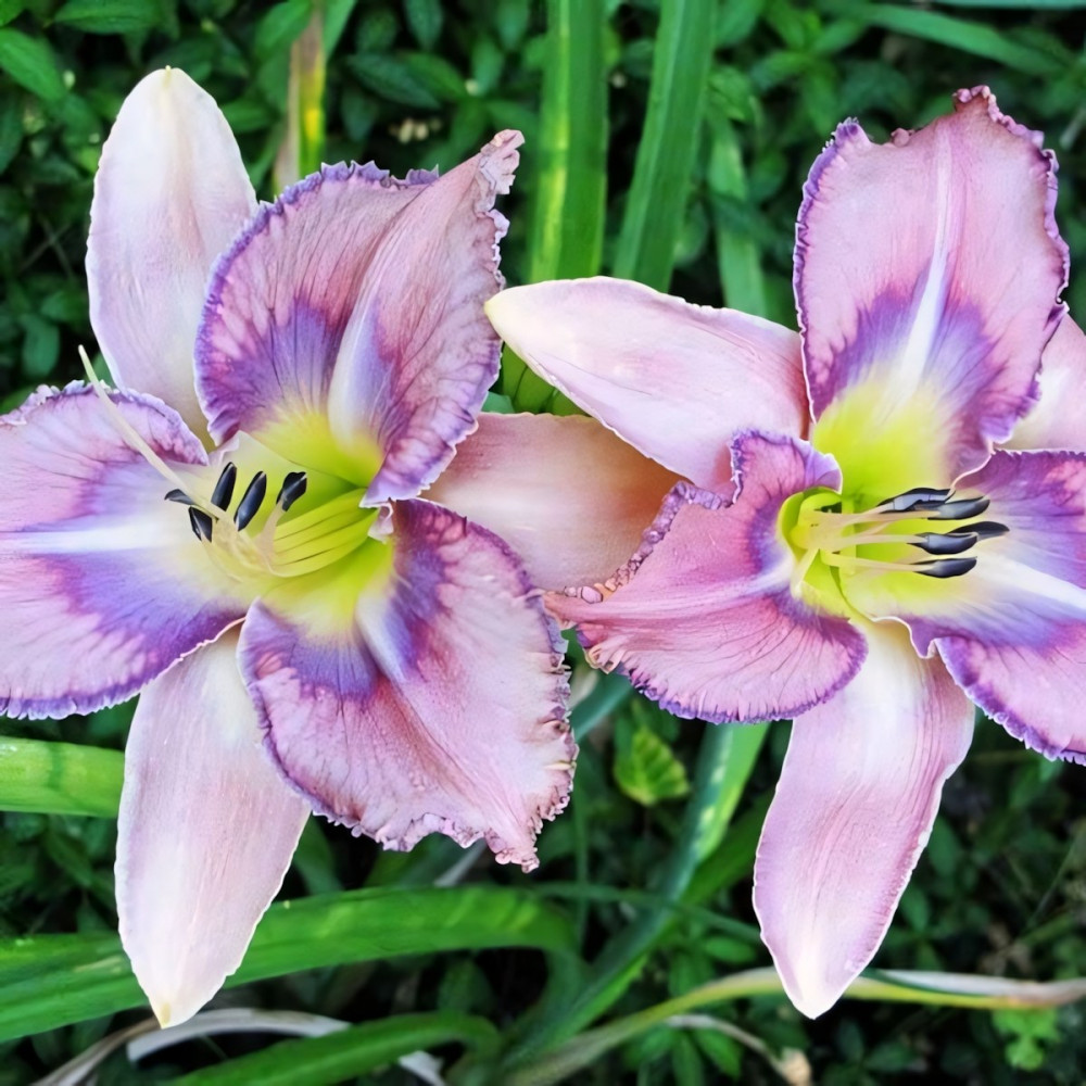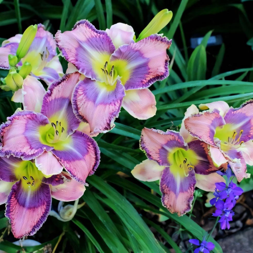 Цветок розово-лавандовый с голубоватым глазом и такой же каймой по краям гофрированных внутренних лепестков. Душистый. Вечнозеленый, тетраплоид. Цветки лилейника собраны на высоких цветоносах по несколько штук. Одновременно в соцветии цветет до трех цветков.