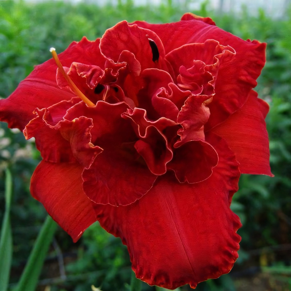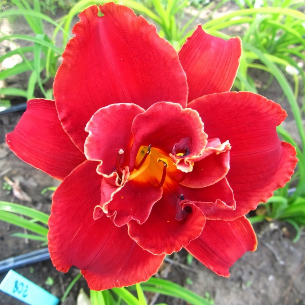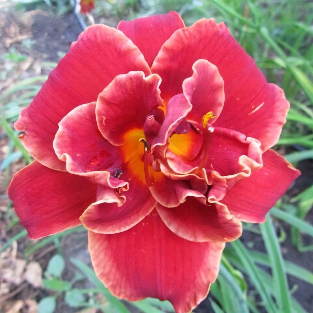 Махровый бархатный цветок кирпично-красного цвета. Светло-зеленое горло и тонкая золотистая кайма. Повторноцветущий.