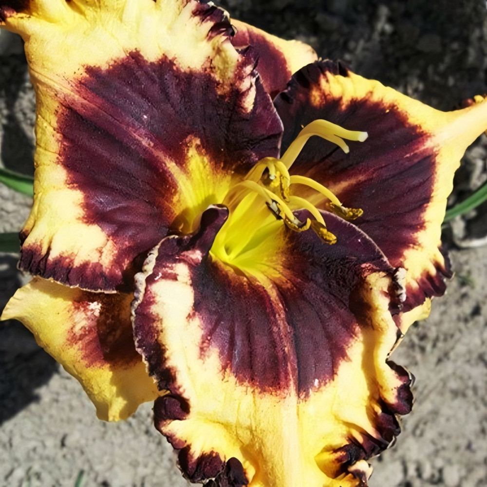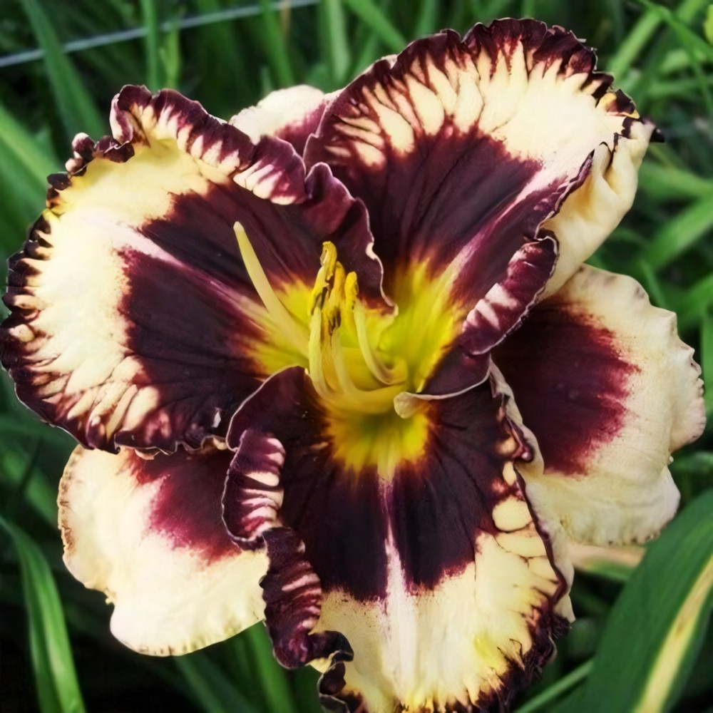 Кремовый с темно-бордовым глазом и такого же цвета гофрированной каймой. Высота - 55 см; диаметр цветка - 15 см.