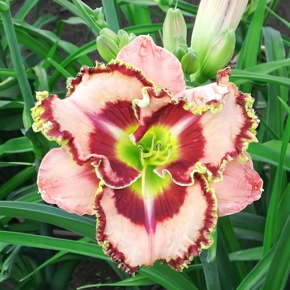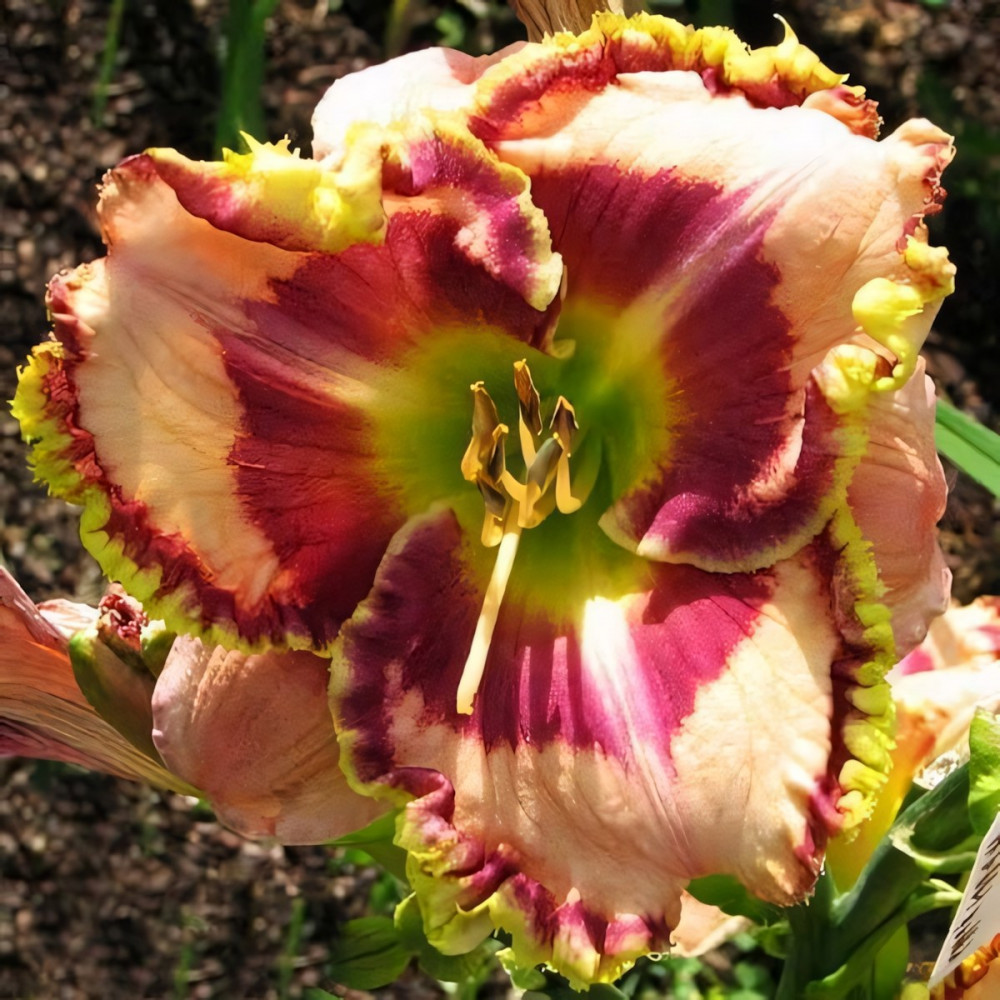 Высота растения - 81 см, диаметр цветка - 15 см. Зеленое горло, лавандовый фигурный глаз на кремовых лепестках с салатовой зубчатой каймой.