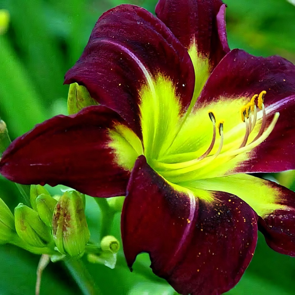Цветок бархатный насыщенно темно-бордовый с зеленым горлом, повторное цветение. Высота растения - 60-70 см, диаметр цветков 8-9 см.
