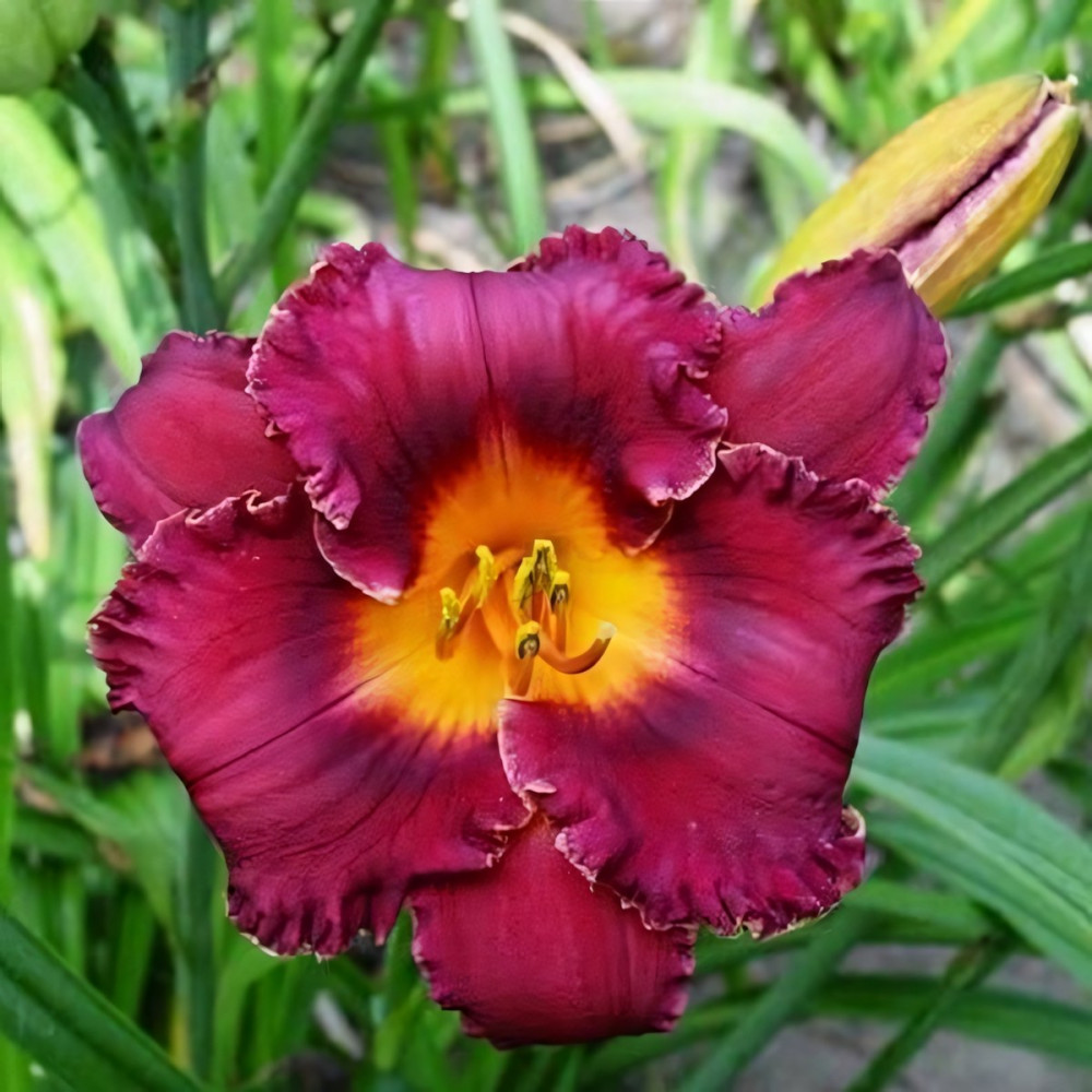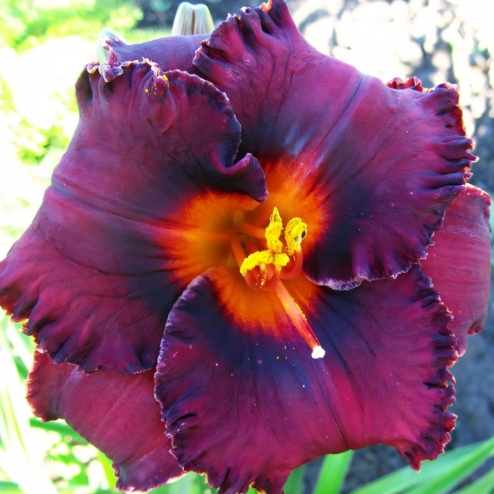 Пурпурный цветок с более темным глазом и ярко-желтым горлом, гофрированный. Высота растения - 60 см, диаметр цветка до 14 см.