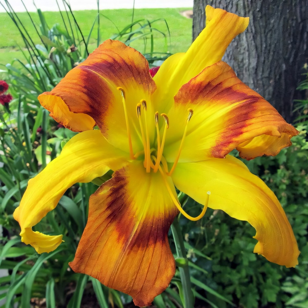 Высота растения - 91 см, диаметр цветка - 23 см. Огромный, средне-оранжевый цветок с горящим оранжевым глазом и окантовкой.