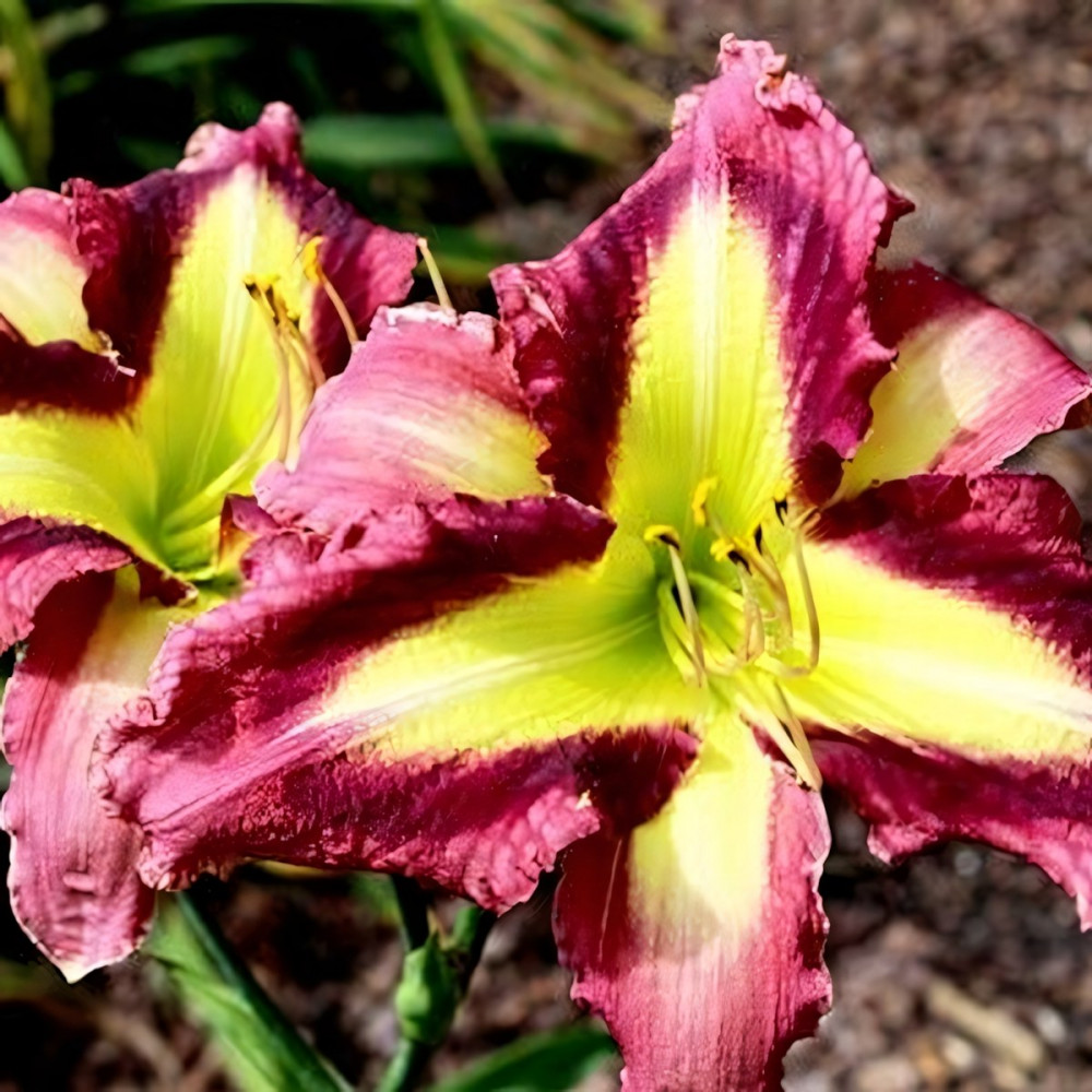Гигантский цветок лилейника с зеленым горлом и темно пурпурным призматическим глазом переходящим в пурпурно-розовые лепестки. Это самый высокий сорт лилейника с призматическим глазом!