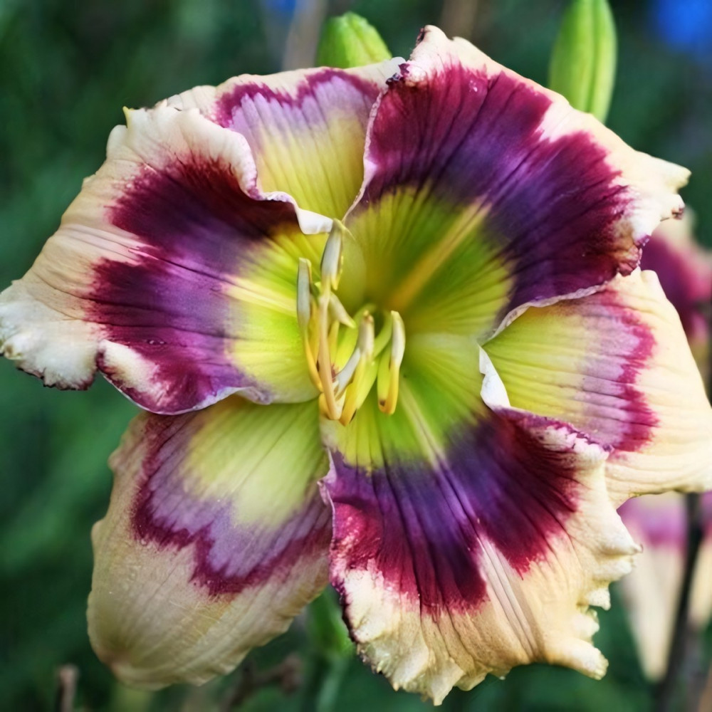 Ремонтантный, ранний лилейник, янтарно-кремовые лепестки с пурпурным калейдоскопическим глазом переходящим в калейдоскопическое зеленое горло.