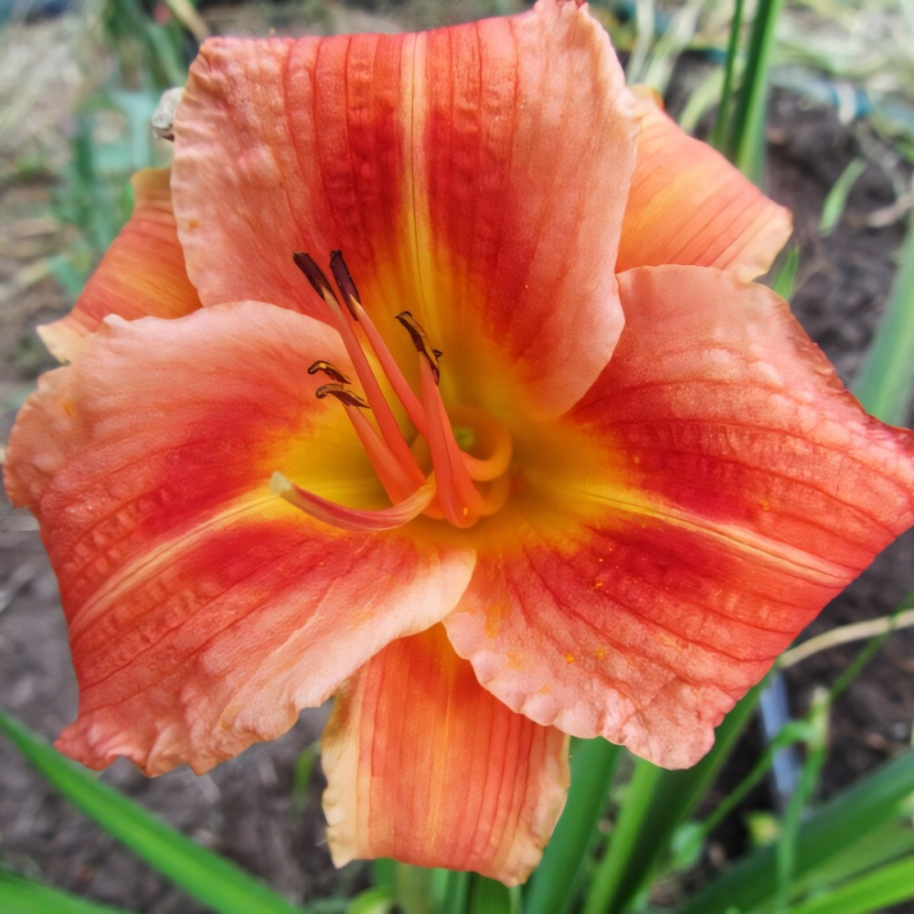 Ярко-красные цветы с легкой гофрировкой края. Светлая средняя линия, желто-зеленое горло. Полувечнозеленый, диплоид.