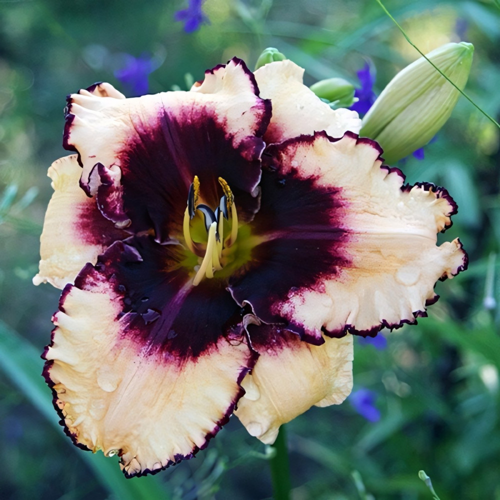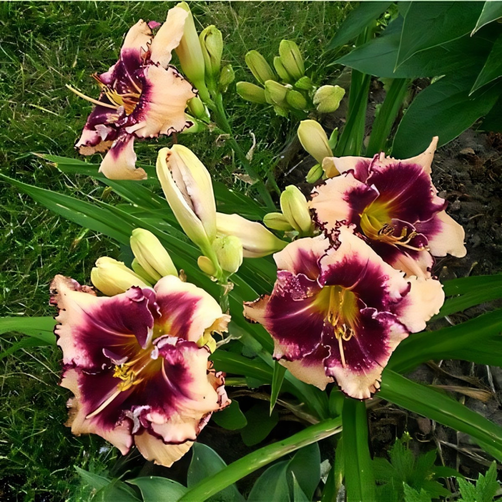 Высота - 60 см, диаметр цветка - 15 см. На кремово-кофейных лепестках этого цветка огромное черно-бордовое пятно и такого же цвета темная гофрированная кайма. Очень выразительный и красивый.