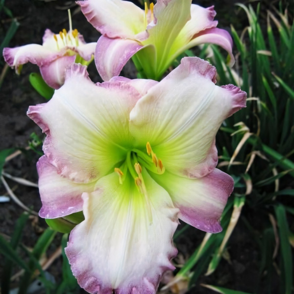 Нежные белые лепестки, с тончайшей розово- лавандовой окантовкой на слегка гофрированных краях, и ярко-желто-зеленым горлом. Высота растения - 65 см, диаметр цветка - около 14 см.