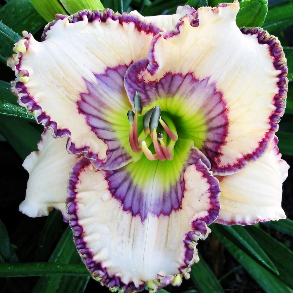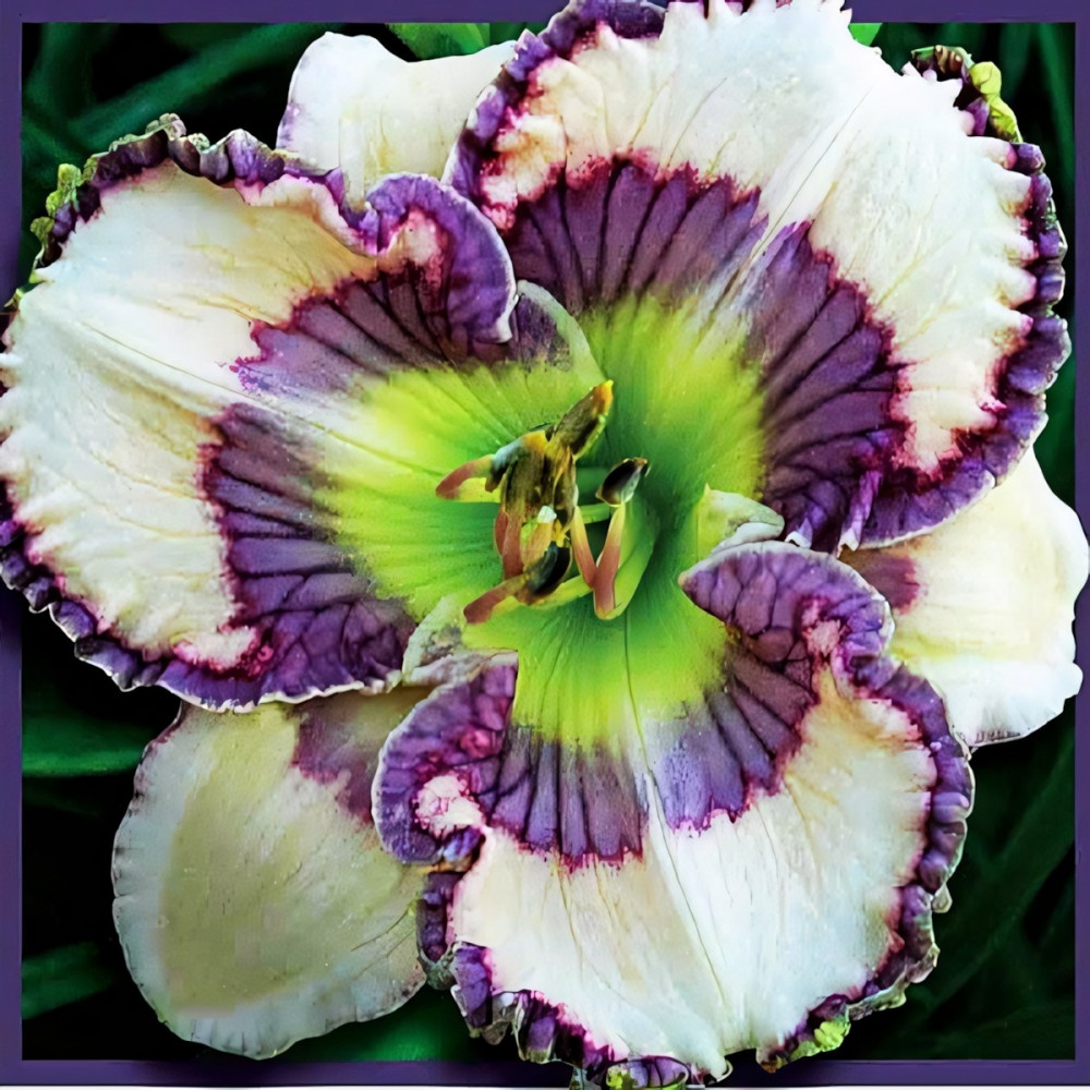 Высота растения - 70 см, диаметр цветка - 14 см. Белый, фиолетовый глазок над зеленым горлом и фиолетово-желтая кайма.