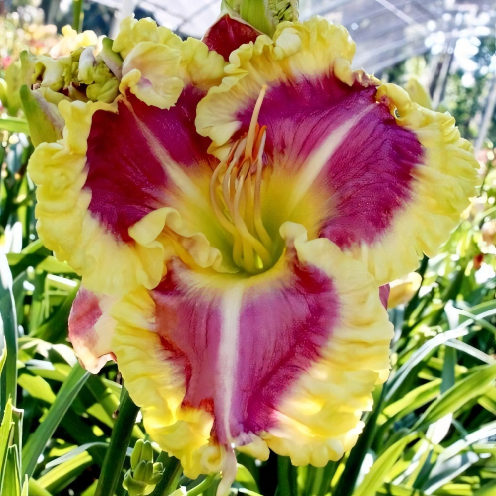Розово-лавандовый красавец с огромной гофрированной желто-зеленой окантовкой около 4 см.