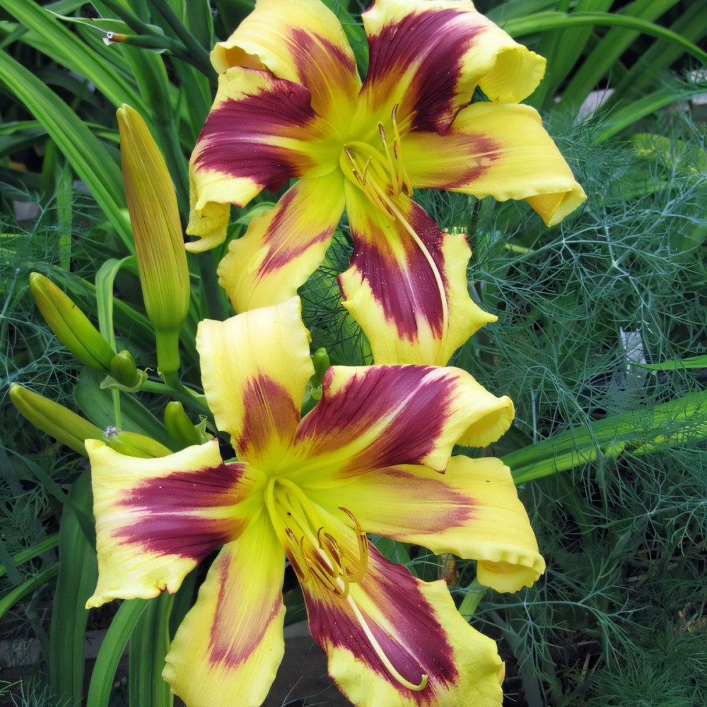 Высота растения - 102 см, диаметр цветка - 21,5 см. Яркий, желтый с пурпурным глазом, до 30 бутонов и 4 ветви.