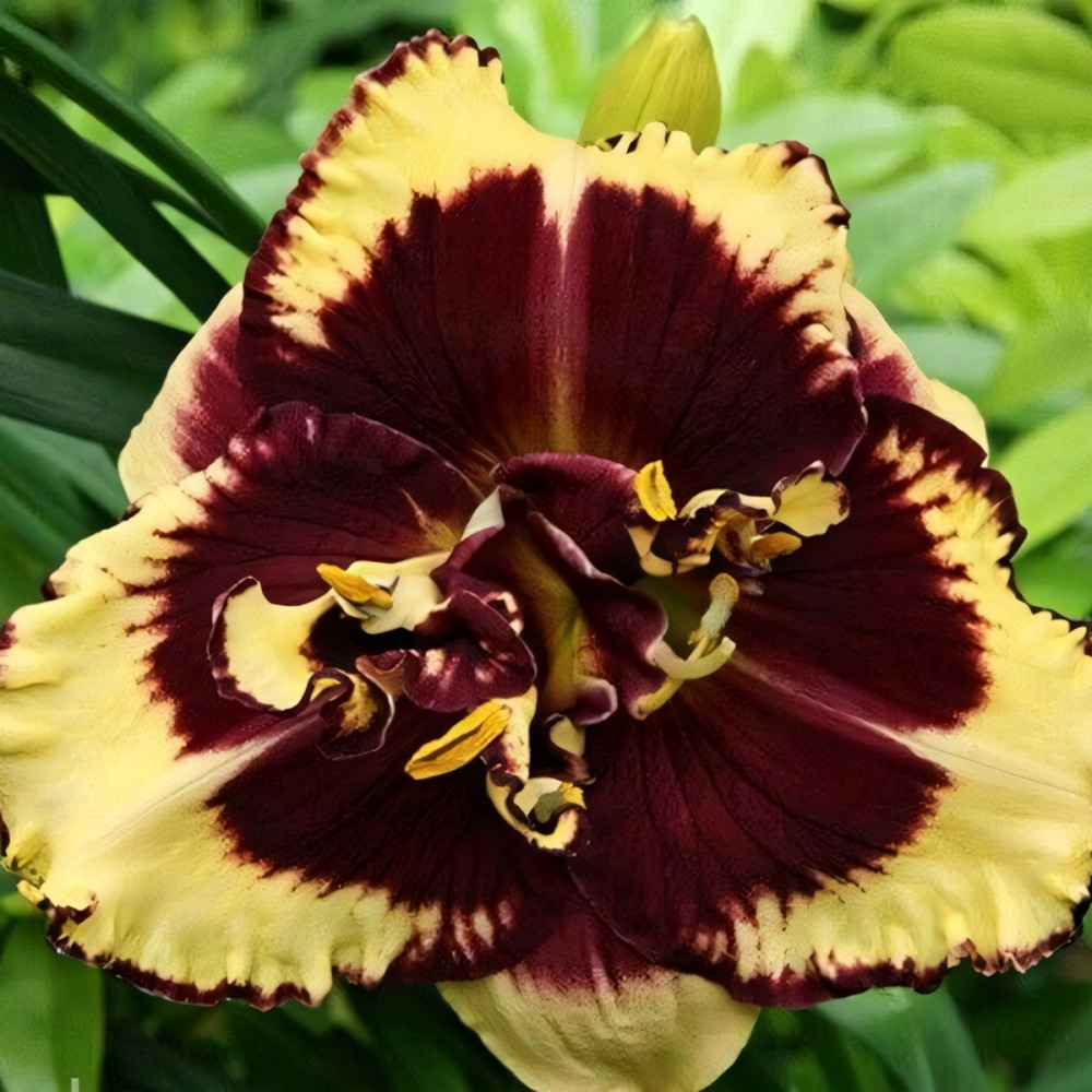 Сорт 2015г., светло-желтый с обширным пятном глубокого бордового цвета и тонким бордовым кантом. Высота растения - 65 см, диаметр цветка - около 15 см.