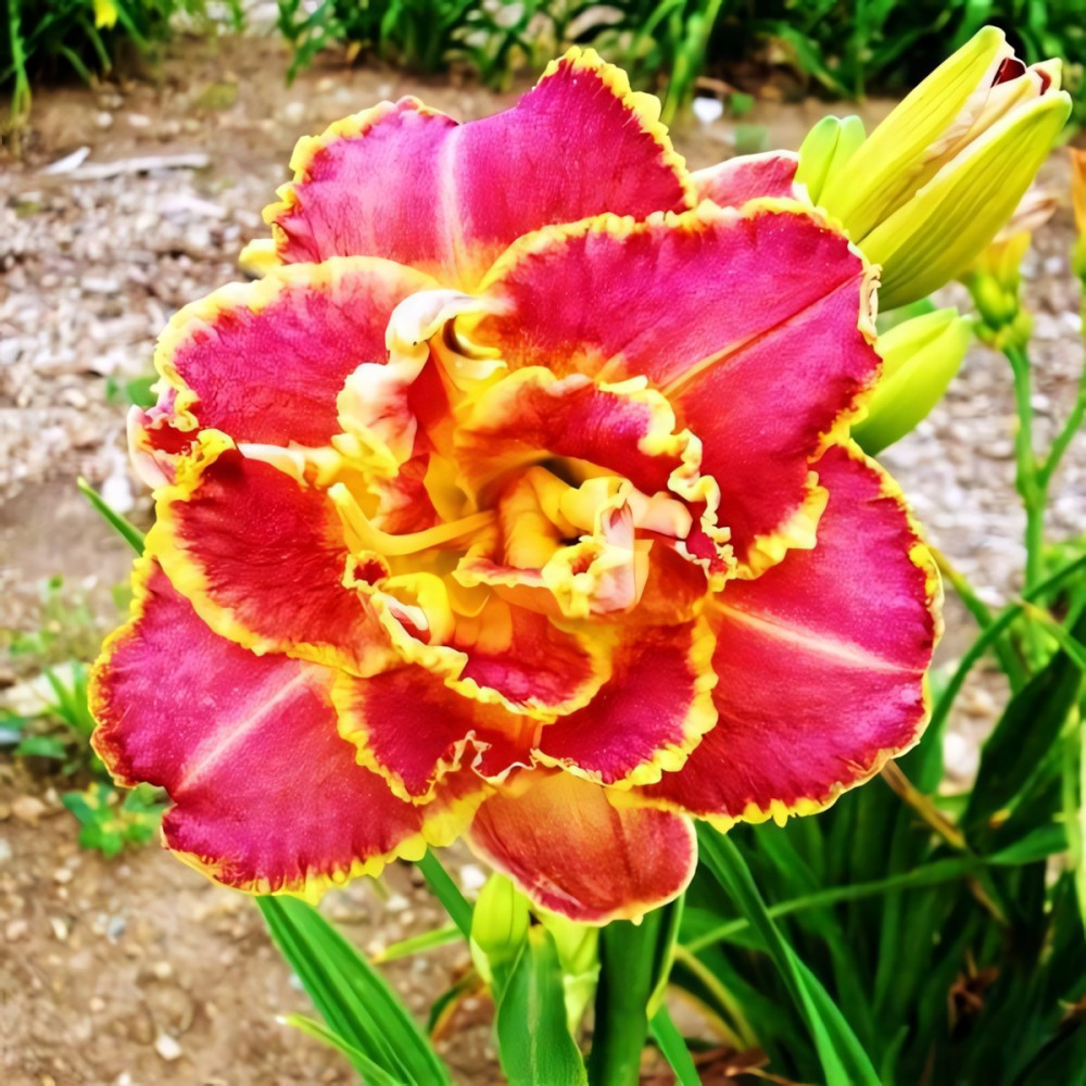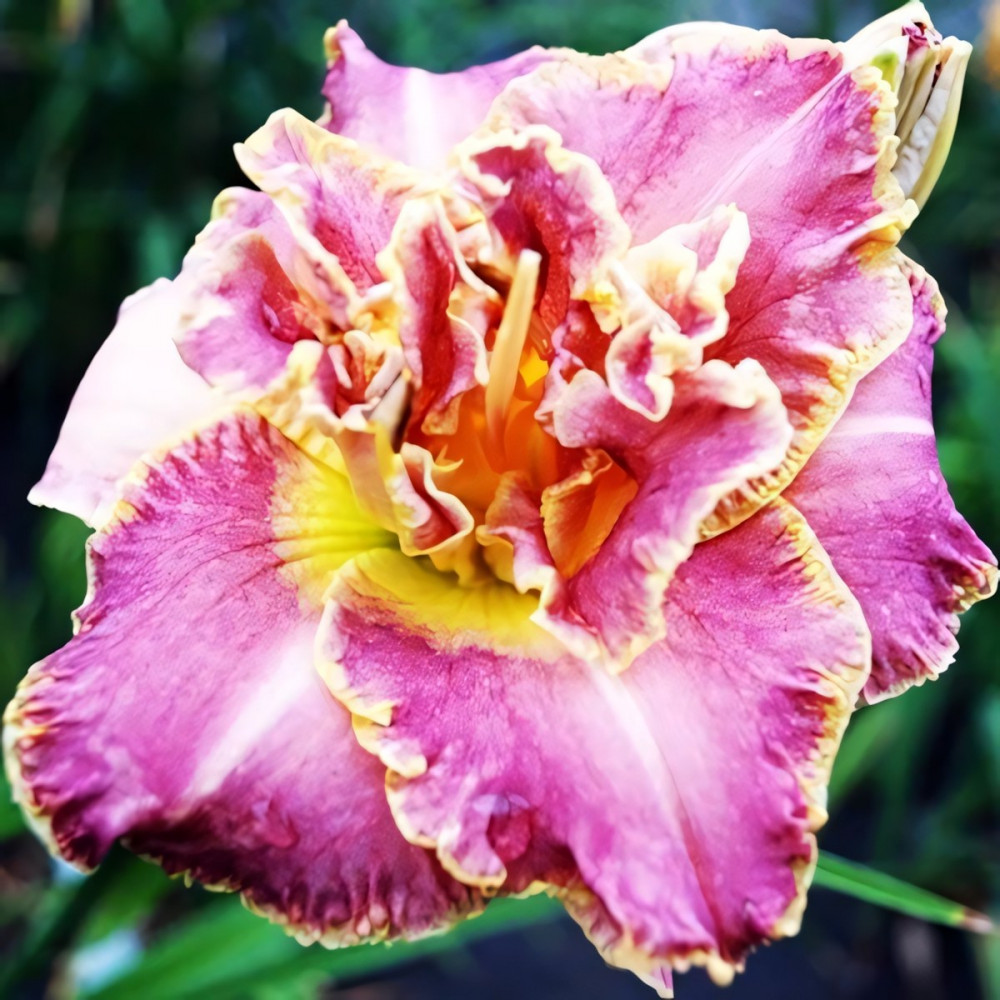 Махровый лавандо-розовой цветок с зеленым горлом. Широкие лепестки окружены золотистой гофрированной каймой. Имеет подчеркнутый светлый водяной знак. Цвет переменчивый: в жару светло розовый, в прохладную погоду, насыщенный лавандово-розовый. Обильное эффектное цветение в середине лета.