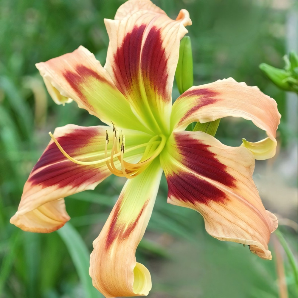 Обильно цветущий ремонтантный сорт с трехцветными цветками; закрученные кончики оттенка нежного персика отделены от лаймового горла широкими вишневыми сигналами в виде размытых треугольников.