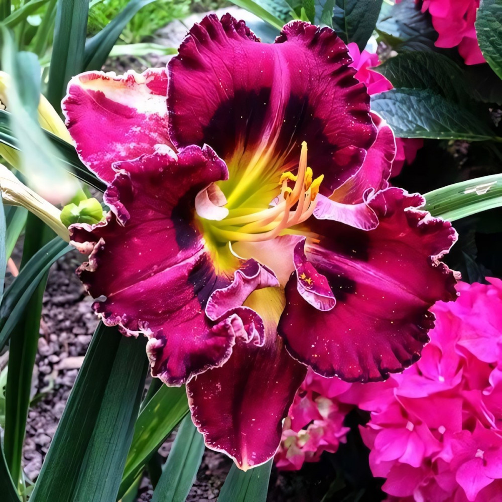Посадка лилейника: Для посадки культуры необходима посадочная яма большего диаметра, чем корневая система растения. На дно лунки насыпается холмик из плодородной почвы, вносится столовая ложка гранулированного комплексного цветочного удобрения или перепревший навоз, разбавленный древесной золой. На вершине холмика размещают растение, аккуратно расправляя его корневую систему и засыпая ее грунтом так, чтобы корневая шейка не была заглублена ниже 2 см. Посадочную яму необходимо тщательно заполнить грунтом, последовательно уплотняя пространство таким образом, чтобы в земле не оставалось пустот. Засыпанную землей лунку обильно увлажняют.
