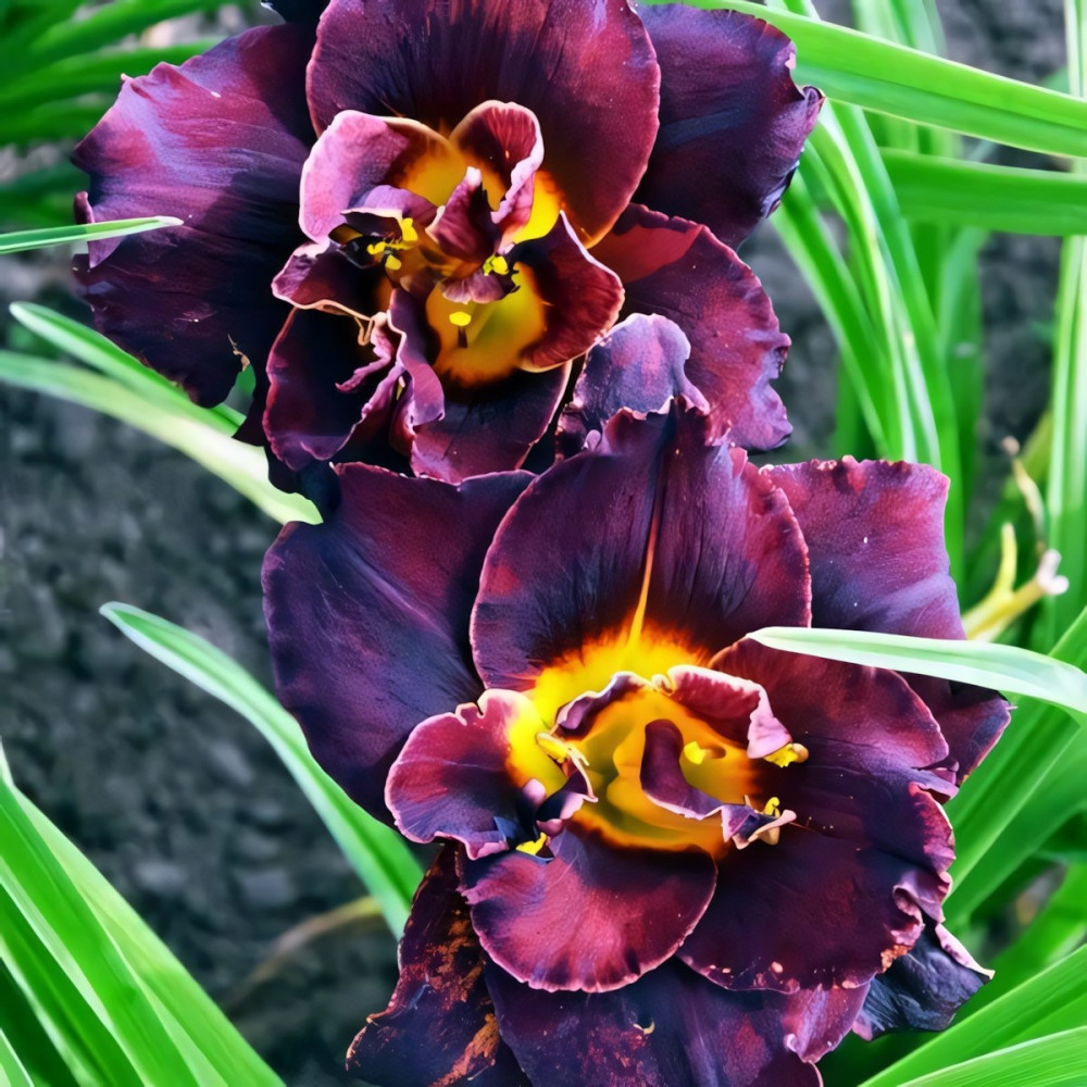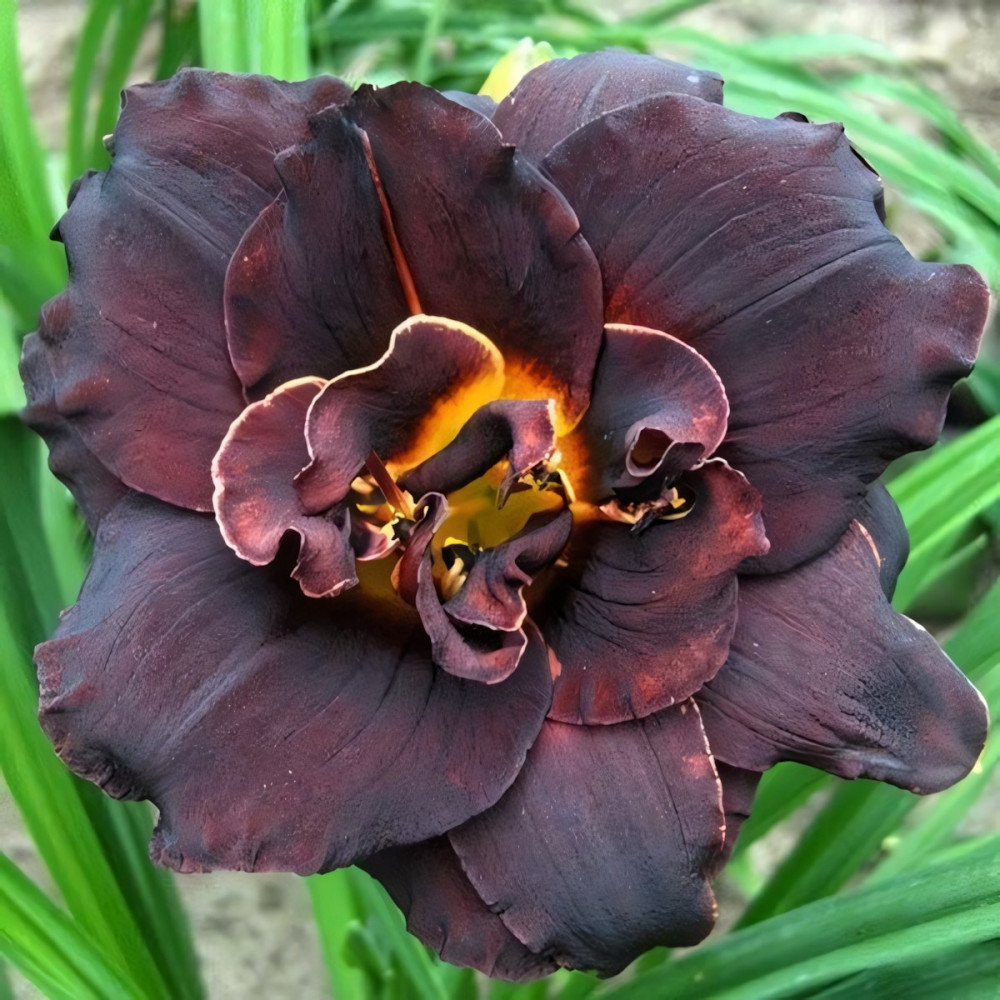 Многолетнее, травянистое растение. Цветок махровый, тёмно-фиолетовый с жёлтым центром. Обладает приятным ароматом. Листья узкие, мечевидные. Цветение обильное, повторное.