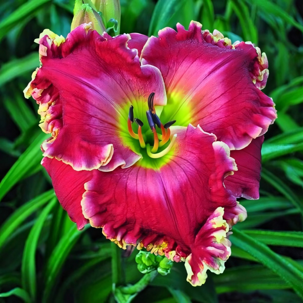 Огромный арбузно-красный с большим розовым глазом выше зеленого горла и золотистой каймой. Цветок очень красиво гофрирован, с сильным алмазным напылением. На каждом цветоносе 28 бутонов. Настоящий король сада! Высота растения - около 80 см, диаметр цветка - до 19 см.
